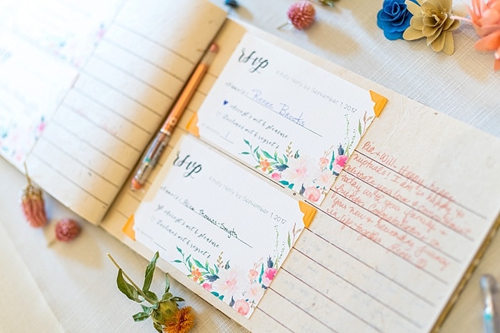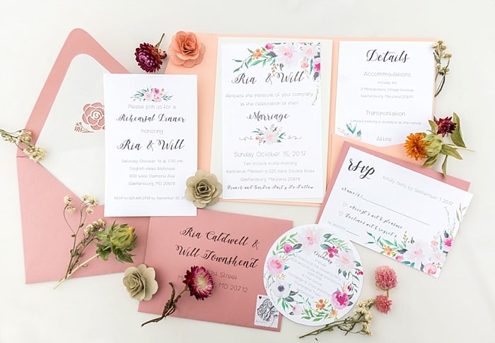 My favorite part was the invitations. I selected the paper, the interior and exterior envelopes, the graphics, the fonts… everything. I even bought stamps from 2015 because I wanted the design to match my theme and look nice on the envelope. I chose peach and sage green as the base colors for the invitation suite because they are scalable colors (not too pastel, not too rich) that would allow me to build in additional dimension through the graphics and other small details.