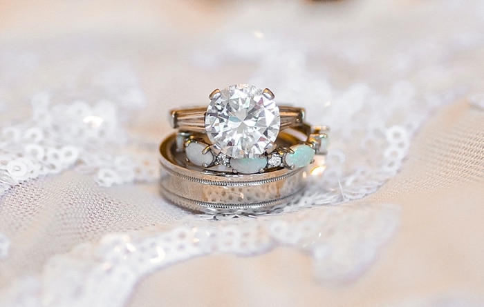 My engagement ring belonged to my husband’s grandmother. Before he proposed, I had been thinking about an opal engagement ring. Opals are my favorite – I love the different colors! Anyway, since there are no opals on my engagement ring I wanted an opal wedding band. The trick was to design something that would stand up to my grandmother-in-law’s 5-carat diamond ring. I worked with a designer to select five oval-cut natural blue Australian opals, each separated by a small diamond. As you can tell from Jessica’s photos, the effect is beautiful!