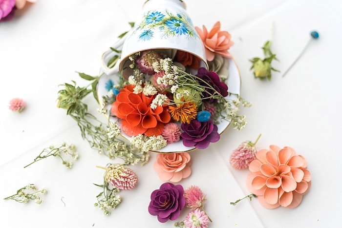 Another of my favorite traditions from when I lived in the UK was afternoon tea. I decided to integrate that tradition with the garden party theme via my centerpieces. All the china featured in the centerpieces was thrifted. I felt that using dried flowers in the centerpieces would be too flat- like literally, it would lay flat on the two-tier trays and in the tea cups. So I devised the idea of the wooden flowers! I found a woman in the Philippians that makes flowers from peeled birch bark and I bought hundreds of plain flowers in different styles (roses, dahlias, lilies, etc.) And then I had to paint them. It took so long to paint each flower that by August I had enlisted all the bridesmaids and my husband to paint flowers. I’m pretty sure each of my friends painted at least 25, and my husband finished the last 50 when I couldn’t stand painting the little wooden flowers anymore. For one flower, the poor man didn’t realize that I was mixing my own custom paint colors and he painted it this horrible purple right out of the tube. On the wedding day, we had a scavenger hunt for what we dubbed “the ugly Willy flower”. Regardless, the wooden flowers gave the centerpieces the pop I wanted. Now I just have to figure out what to do with all the china and flowers…