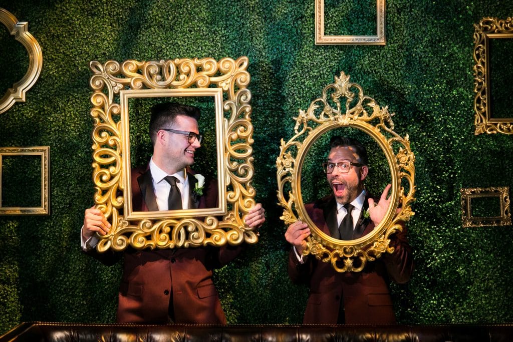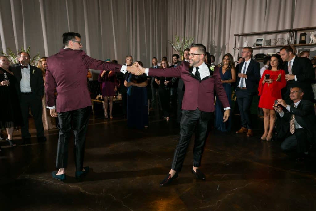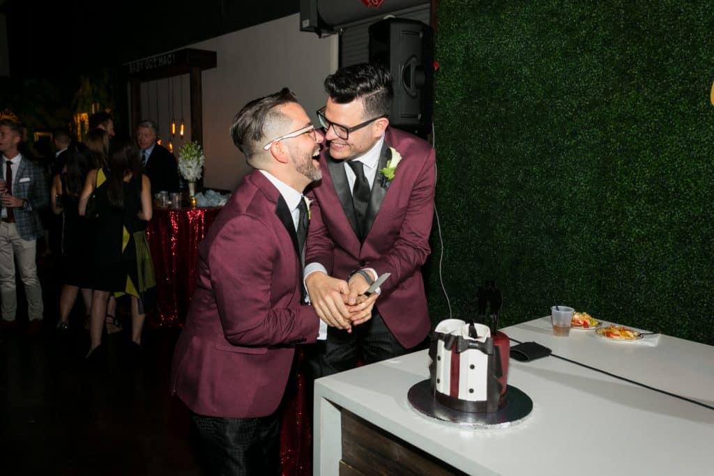 The couple wanted to have their relatives who have passed represented, so they incorporated photos of their grandparents in the Back bar decor along with other elements that had some meaning to the couple. Guests were able to lounge in leather lounge furniture and maroon sequin linens gave a pop of color to the space. Danny and Ben are lucky to have many talented friends, including Gene Shepard who made their wedding cake for them – Gene was able to take the Grooms suits and create a beautiful and delicious cake for the pair that was a wow piece at the event.