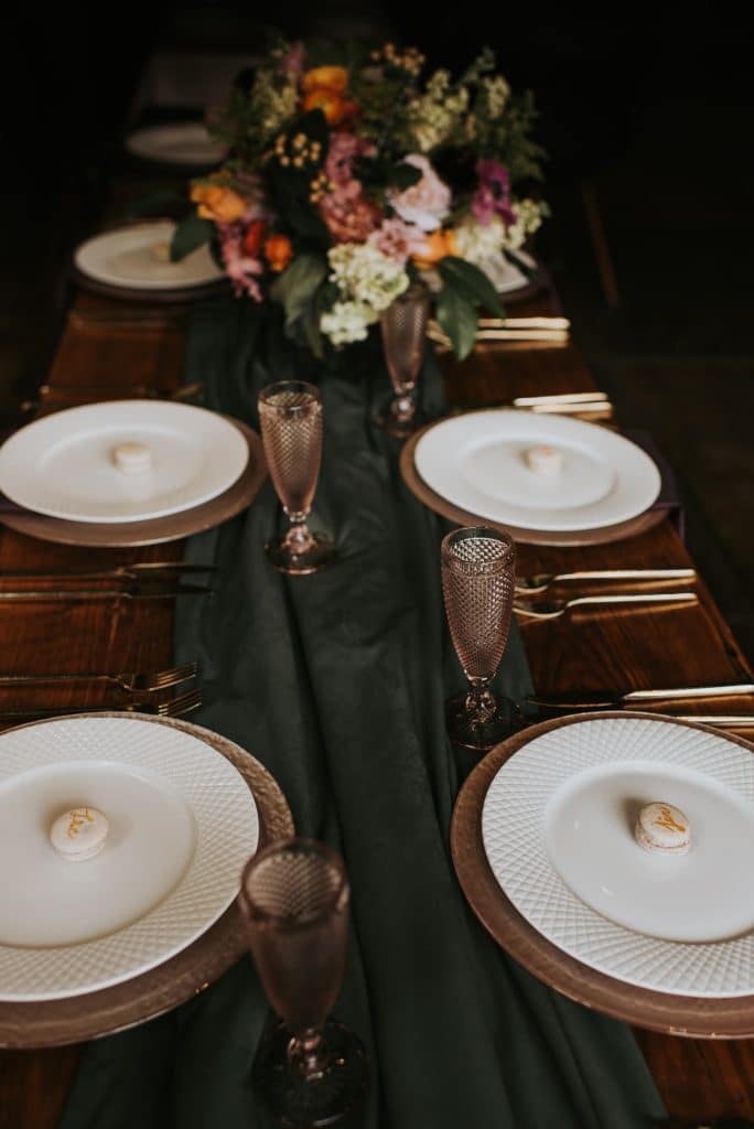 At each place setting how fantastic would it be for a guest to arrive to a vegan macaroon with their name on it? That is exactly what our guests would arrive to as a lavender flavored macaroon from Vegaron with their names scrolled in edible gold awaited them – a perfect DIY project or something that can be sourced out.