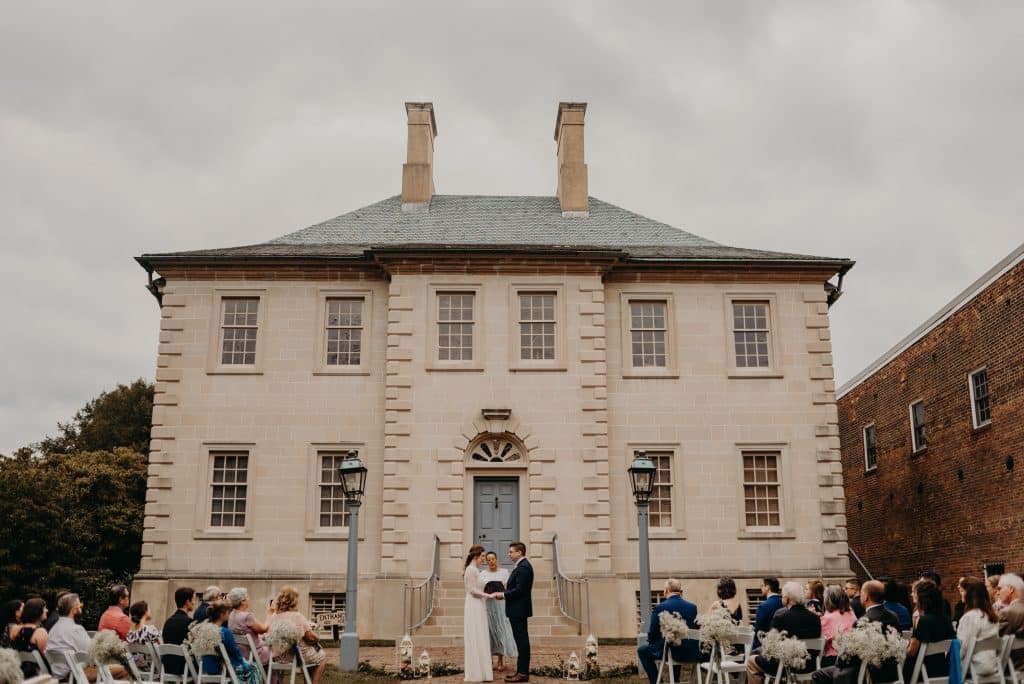 Both history buffs, Travis and Kate decided to host their wedding weekend in Old Town Alexandria early on, and prioritized venues that were timeless, elegant, and storied in their own right, so that minimal decor was needed, and it felt like their moment was adding to the long history of these spaces. The front facade of Carlyle House, an 18th-century mansion, was the perfect backdrop for their ceremony, where the bride’s best childhood friend played period-appropriate violin music as guests arrived.