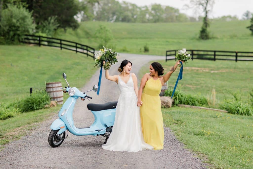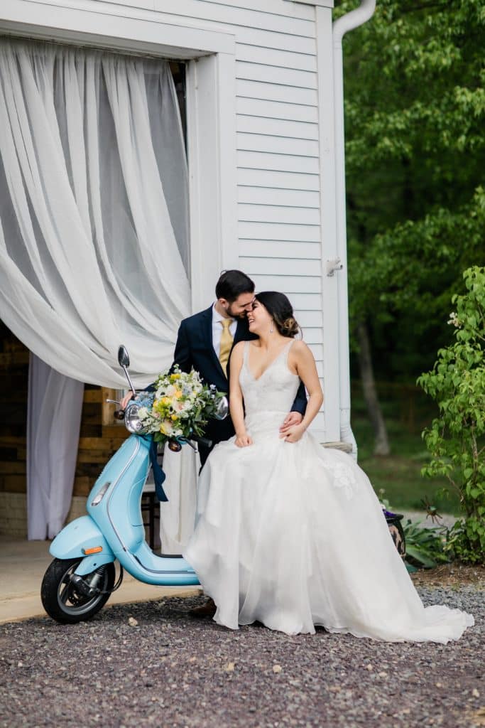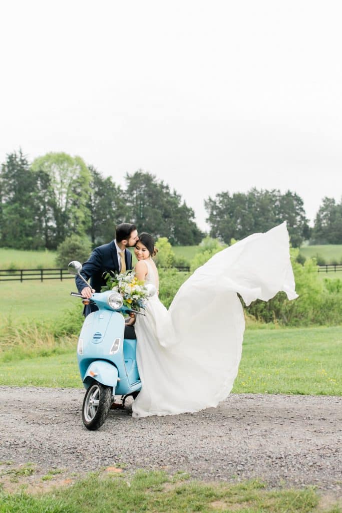 The vintage details were essential to the shoot, including the golden yellow furniture pieces, silver candelabras, Italian glass stand, urns and more. No detail was left untouched down to the gorgeous baby blue Vespa and photo wall with a linen sign that read, “Love Always Wins” in Italian. Guests found their seats by lemons hanging from a tree as they walked in.