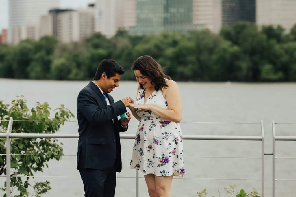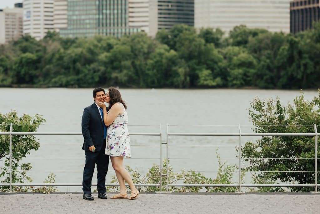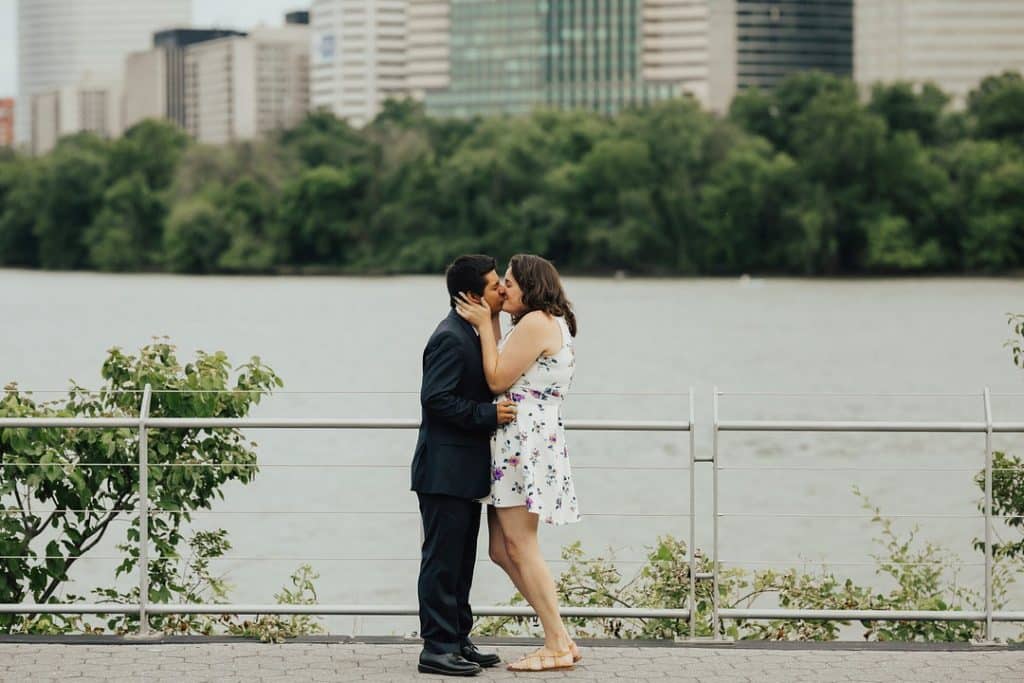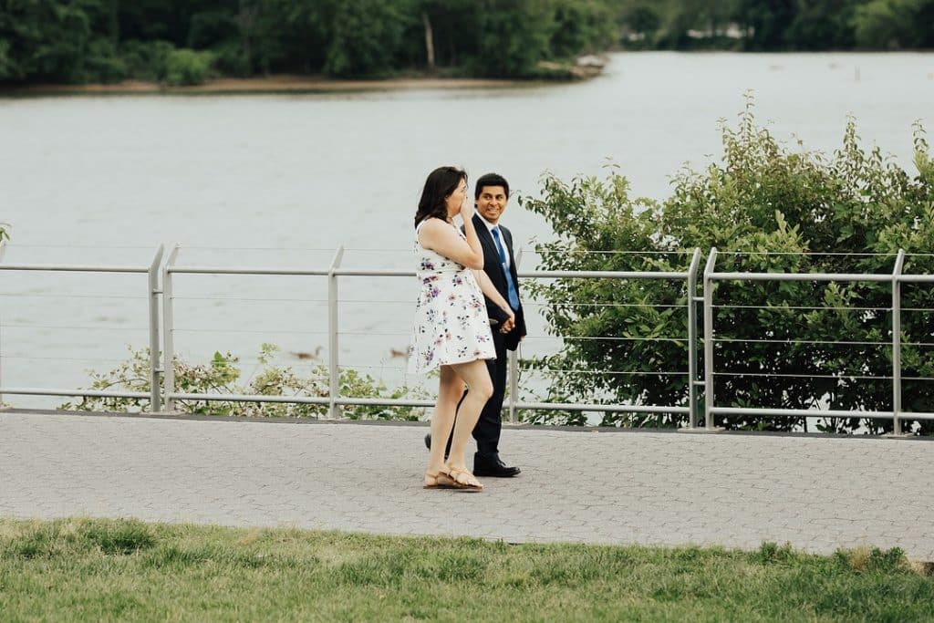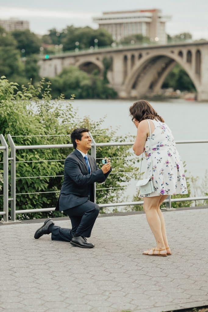 I planned a fancy date in Washington, D.C. to celebrate our anniversary. The plan was to eat dinner at the Wharf, and then migrate to the Georgetown Waterfront for our sunset boat tour along the Potomac. I suggested we arrive early to our boat tour so we could walk along the Georgetown Waterfront Park. Our family members and friends from Twin Firs Photography were hiding behind bushes at the Georgetown Waterfront Park the whole time! As we were walking towards a specific section of the park, our family members came out and revealed signs that spelled out “Marie, will you marry me?” I quickly got down on one knee and proposed, as Twin Firs Photography captured the beautiful moment. After the proposal, Marie and I left our family and had a romantic sunset boat tour. When we got home, we popped champagne and screamed “We’re Engaged!”