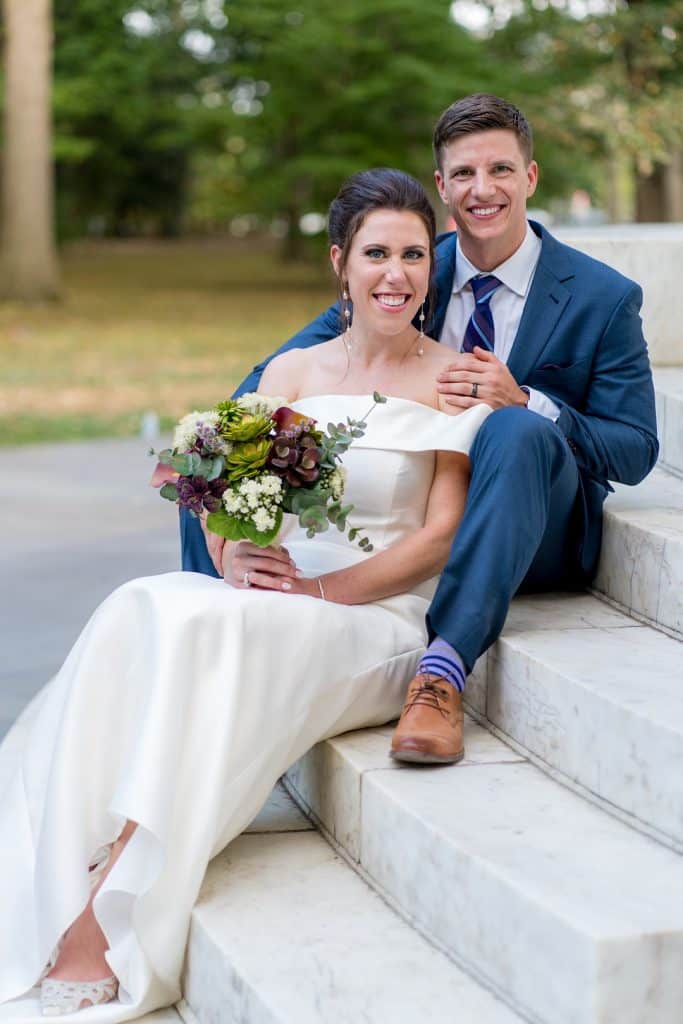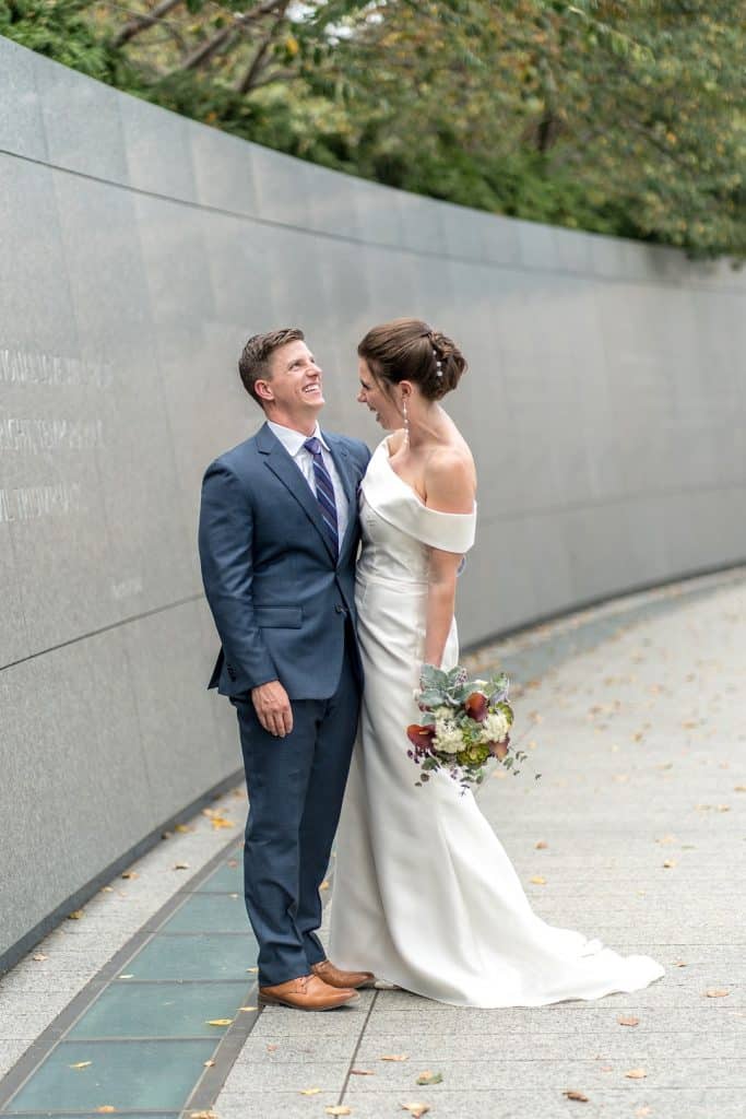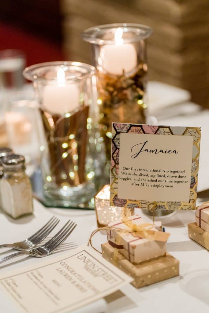 Since meeting online over three years ago, we have been inseparable ever since. We love to laugh, and amongst our friends are known for doing it often. We love being active and outdoors, and also take every chance we can get to travel internationally, which is what made our engagement during a hike in New Zealand absolutely perfect. It is also why we decided to make travel an underlying theme at our reception. Additionally, we both work for the Department of Defense, and over the last three years our relationship has been both challenged and strengthened by two deployments – Mike to Iraq and Lauren to Afghanistan, which also makes the DC War Memorial an ideal location for us (aside from its natural beauty of course!).