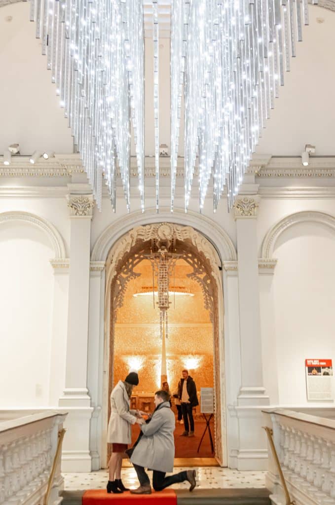 Scott told Lindsay they were headed to the White House for a Christmas tour, the perfect distraction to get her back to the place they had their first date, the Renwick Gallery. As they got to the top of the stairs inside, Scott dropped to a knee, shocking Lindsay, and himself, at how emotional he was. Untraditionally, as Scott opened the ring box and instead of a ring, Scott had planted a button in its’ place. He then stood up unbuttoned a button on his shirt where he had hooked and hidden the ring. Lindsay melted and was on cloud nine, amazed at what Scott had pulled off. They celebrated with a short round of applause from the Renwick patrons. Scott then turned Lindsay to introduce her to Sarah, a photographer from Nova Soul Imagery, who beautifully captured their day. Scott told Lindsay to trust him, he had the whole day planned, and it was just getting started.