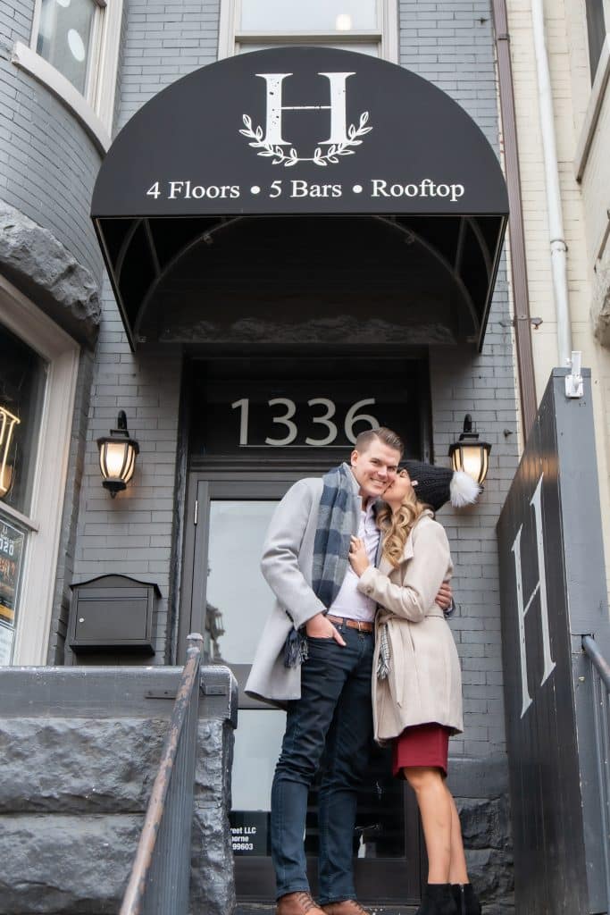After a brief photo shoot and soaking up their moment at the Renwick Gallery, they moved to the “2nd Photo Shoot Location”, to the place they first met, Hawthorne on U St. After a few pictures outside, they went to the 3rd floor, the floor they met on, where the words “you are exactly where you need to be” have coincidentally been painted on the wall since that night they met. Next, they made their way to the roof for one last surprise. Scott had organized their parents, Scott’s sisters, and 30-40 of their closest friends from the area to be waiting for them at the top of the stairs. Another truly genuine surprise, Lindsay couldn’t contain herself that Scott had kept this all a secret from her. The area was decked out with decorations, posters, even button cookies. Scott even made sure Hawthorne was serving the same specialty cocktail as the night they met.