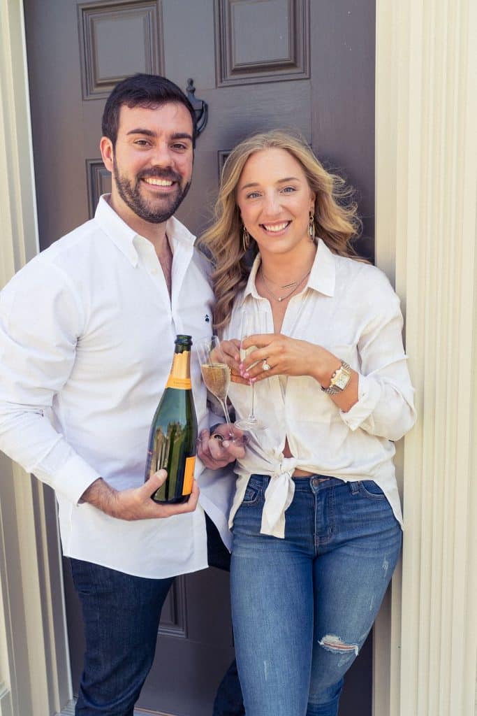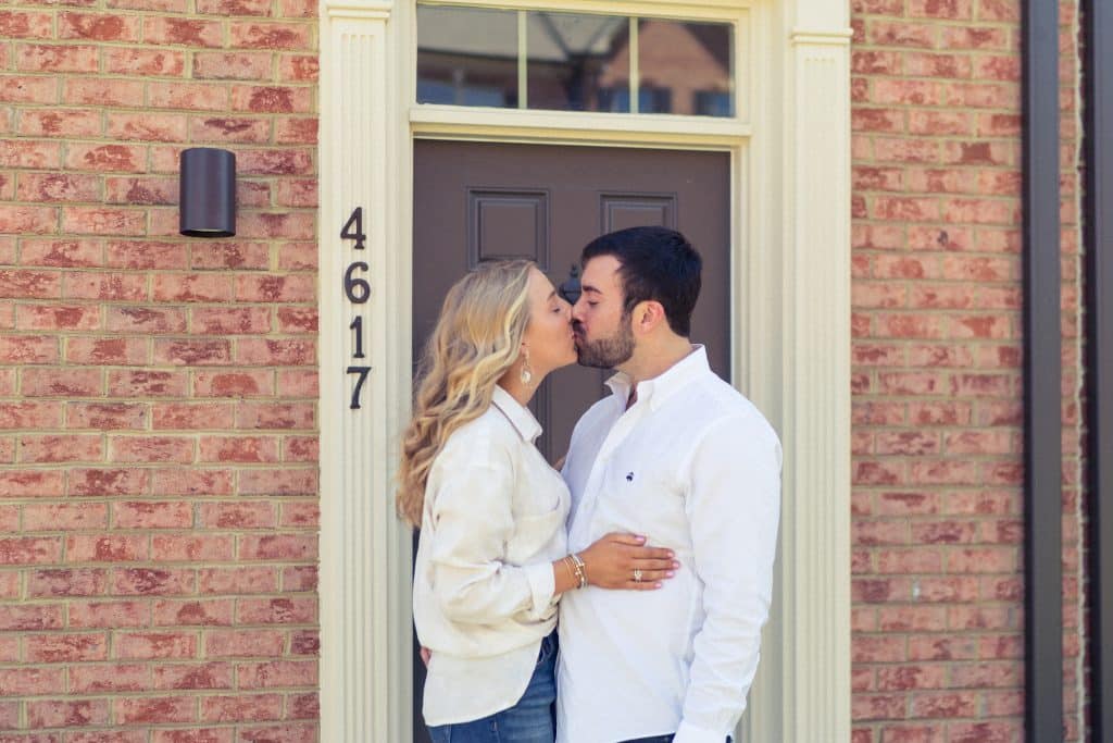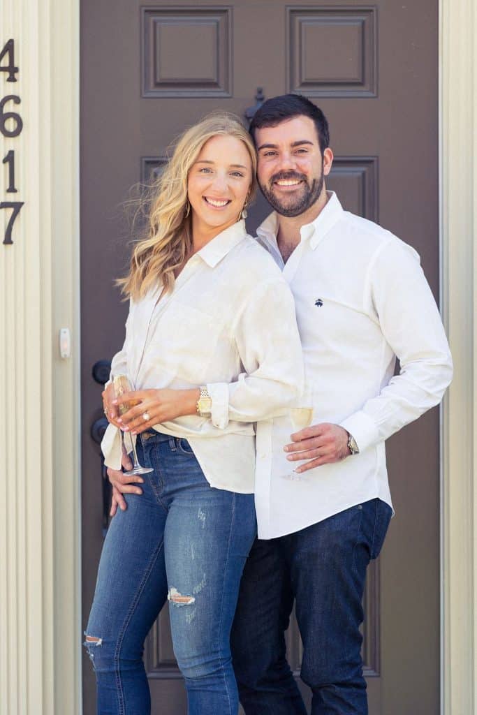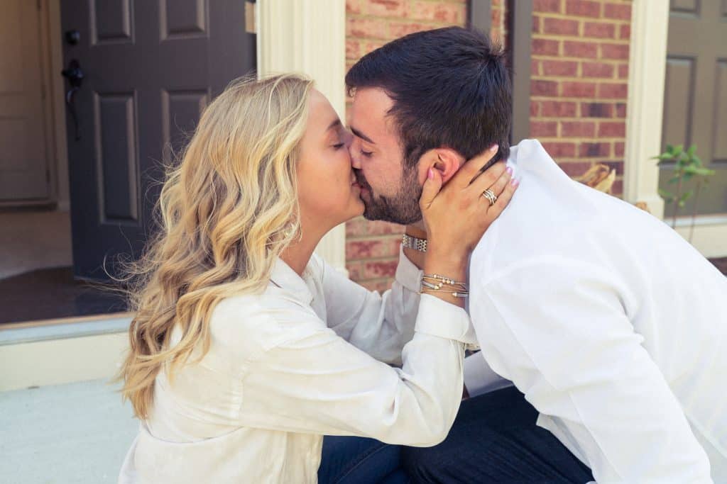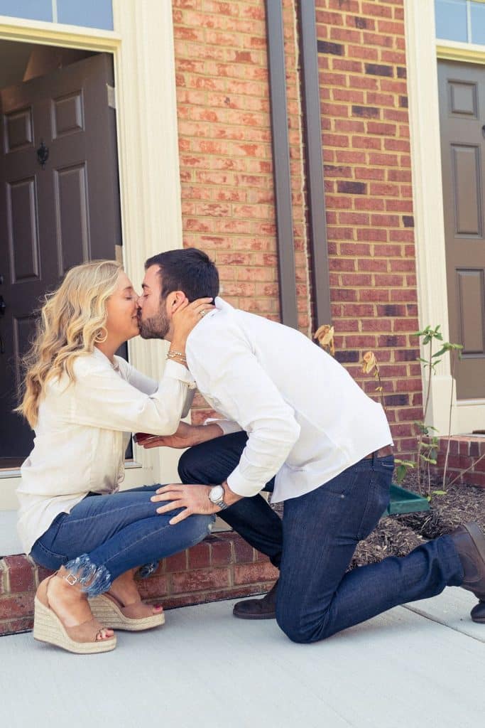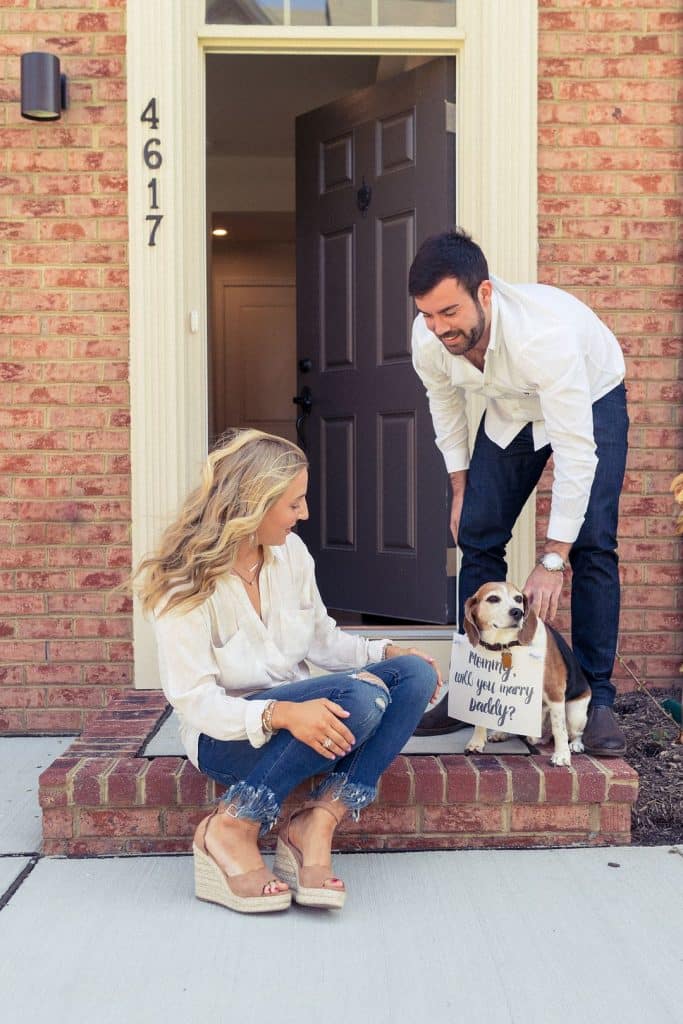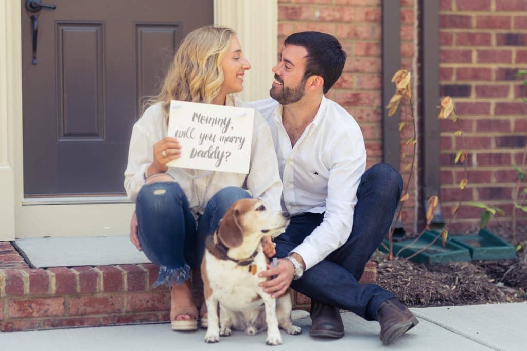 Samantha and I had been looking into buying our first home, and I knew it would be the perfect time to propose. I was trying to think of a special way to surprise her so after closing on the house, I arranged for a photographer for a, “We bought a house!” photo shoot. I set everything up with the photographer, and in the middle of the photo shoot, I ran inside to grab our dog, Tucker. I slipped a sign around his neck with, “Mommy will you marry Daddy?”, and cue the waterworks. She had no idea it was coming, and I am so glad we were able to get the whole moment captured!