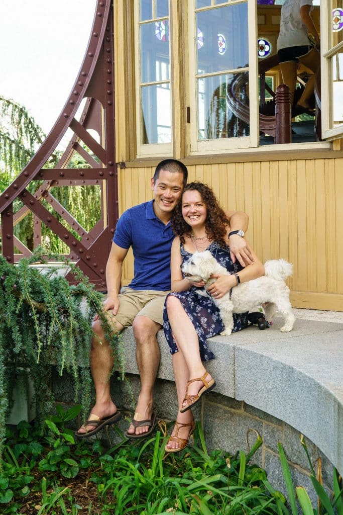He proposed after we had our last Sunday brunch in the city, and we were walking our dog, Cody, in Patterson Park. A man came up to us and was asking about the dog. He asked if he could take pictures of us, and we said sure. A few pictures later, Amie was putting Cody down to continue our walk, and turned around for a huge surprise, captured beautifully by the hired photographer. The moment was ended by people yelling in the park to put the ring on her finger!