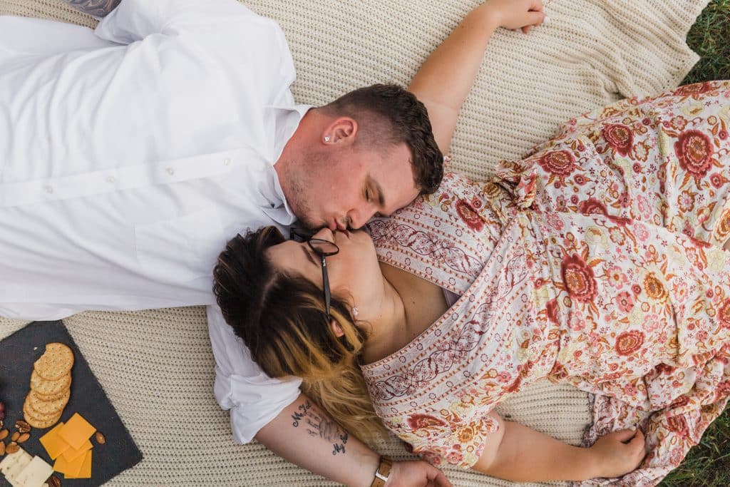 The couple had originally planned for springtime engagement photos but COVID-19 pushed their plans back to this summer. The idea for a summer evening picnic seemed like the perfect way to celebrate being in the great outdoors enjoying each other’s company.