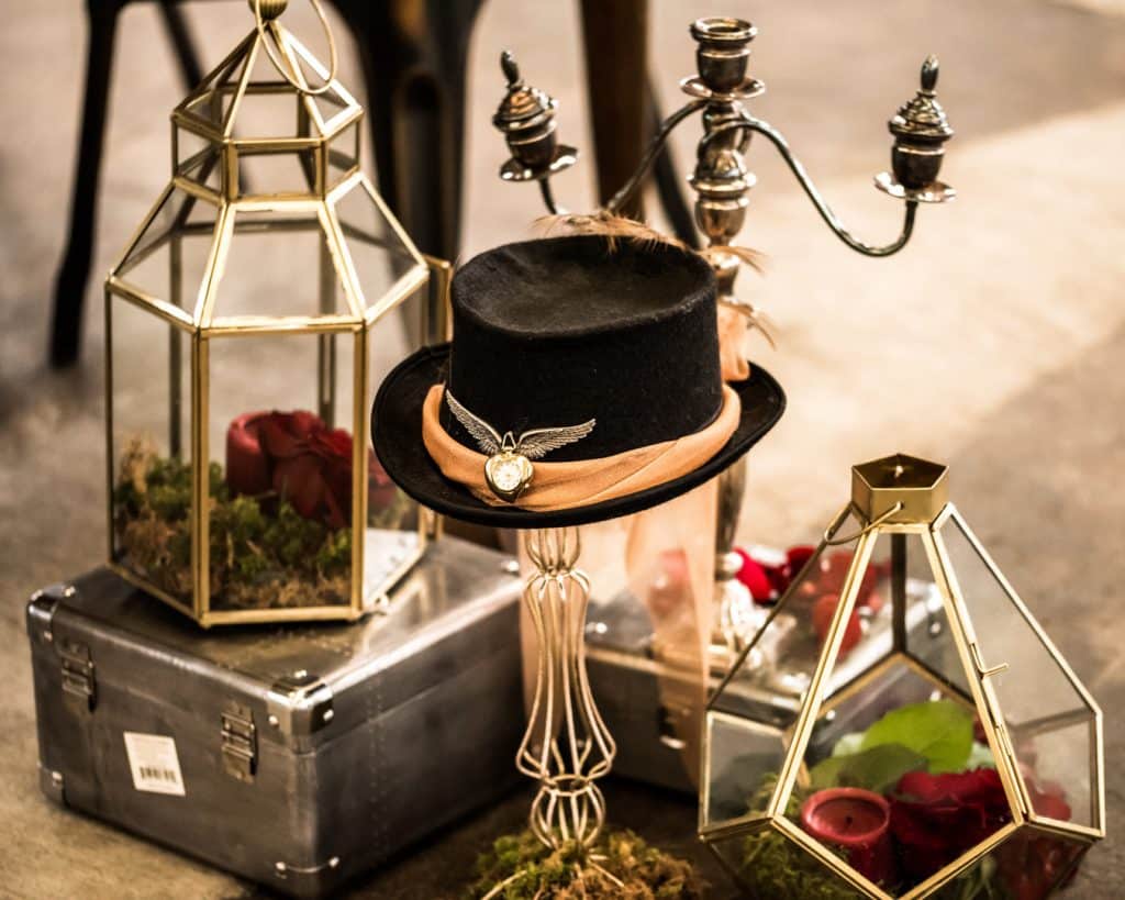 From the event designer: My vision was to show the true Steampunk style, featuring the machinery and mechanical style along with the Victorian style of our modern times.