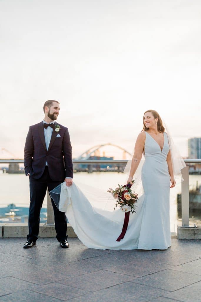 We chose District Winery for a few reasons – one is we are huge winery people! We’re members at a few out west, but given that we were getting married in February, we didn’t want guests trekking down Skyline Drive in snow. When we found District Winery, it was the perfect mix of city and winery. Also, it is in the Navy Yard, and Kyler’s family are the biggest Nats fans, so being down there only made sense! (in fact, his sister’s reception was actually IN nats park!) This was made all the more special when my parents surprised us by hiring the Nat’s racing presidents to come crash our reception for a bit!! Lastly, we picked it because it’s absolutely gorgeous and the exact aesthetic we love…huge windows, water views, industrial space that could be softened with candles and florals.