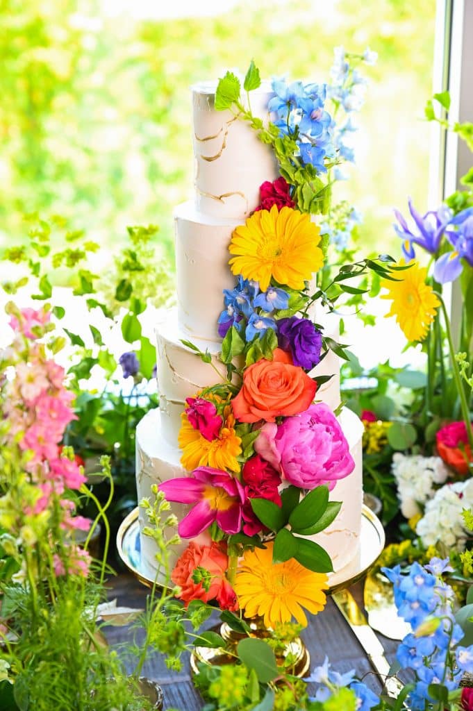To ensure that the wedding had a full garden feel, the reception menu was curated to include apples, colorful foods, and edible flowers. The cocktails, were also colorful, and incorporated seasonal fruits to tie the look together. The reception was completed with a mini garden cake table.