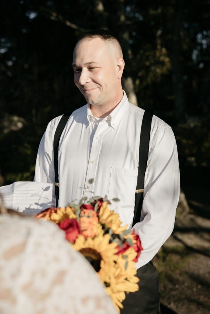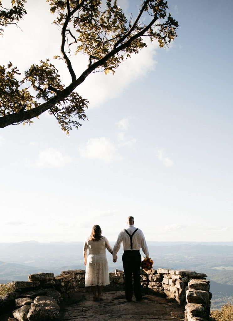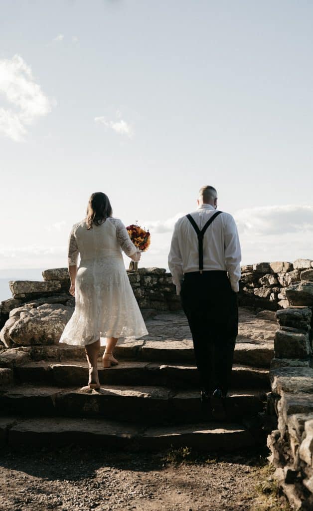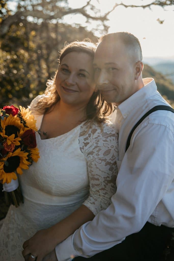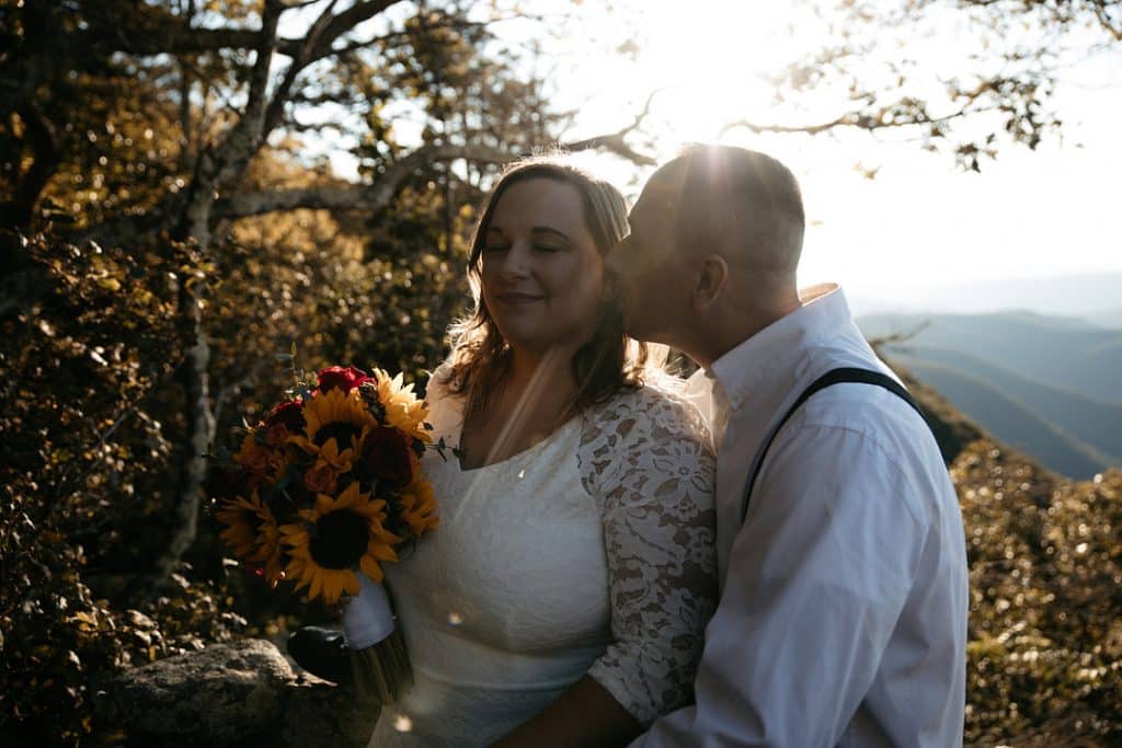 Having never experienced mountain views, Craig and Lauren took the opportunity experience the magic of marriage, elevated to the highest heights in the stunning Blue Ridge Mountains. Eloping in the mountains was freeing. They could do what they wanted – the rules no longer applied. Lauren’s two favorite flowers are sunflowers and roses and she always knew that she wanted to incorporate them into her big day. She chose comfort over tradition, and found a dress worthy of both her wedding and a hike through the woods; a beautiful long sleeve, lace, tea length dress that would speak to the casual and deeply intimate nature of their ceremony.