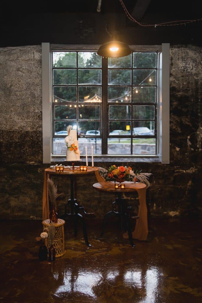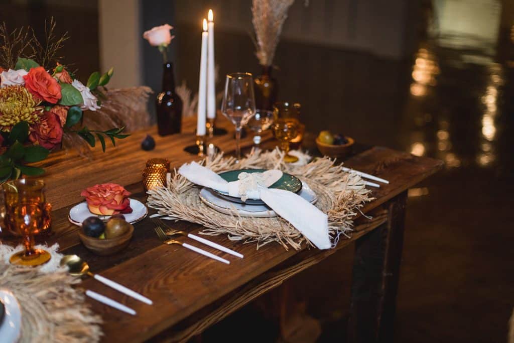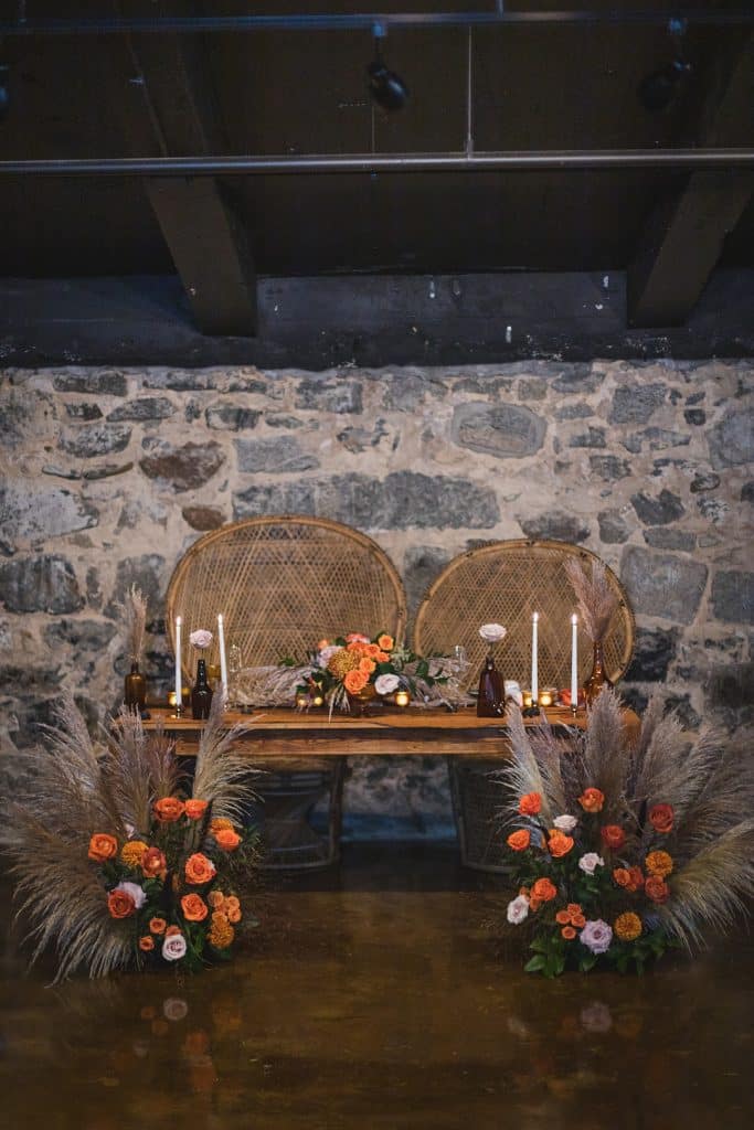 The shoot took place at Main Street Ballroom, a historic building with striking original stone walls and modern industrial finishes with a mix of indoor and outdoor spaces. Something Vintage provided rentals that seamlessly tied together with the ceremony and receptions spaces. A gorgeous farm table served as the base for the sweetheart table design. A rust cloth table runner was complimented by gold candlestick holders, amber bud vases and natural elements like figs. Other elements, like a raffia place mat, organically shaped dinner plates, and modern flatware rounded out the design. The couple lounged in his and hers peacock chairs and the ceremony space featured specialty copper chairs.