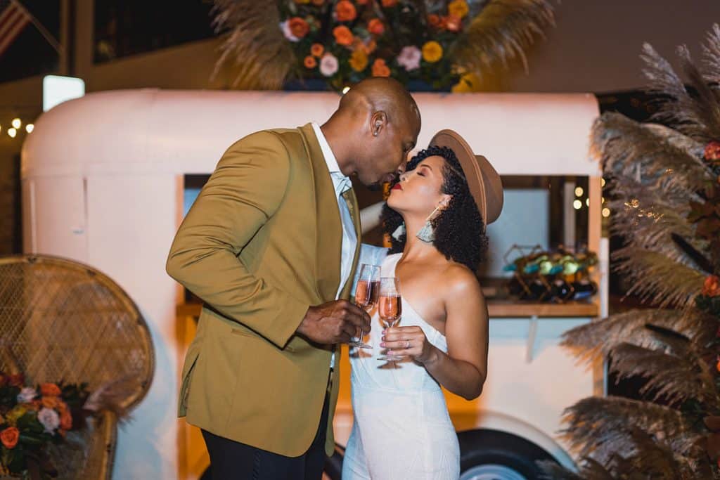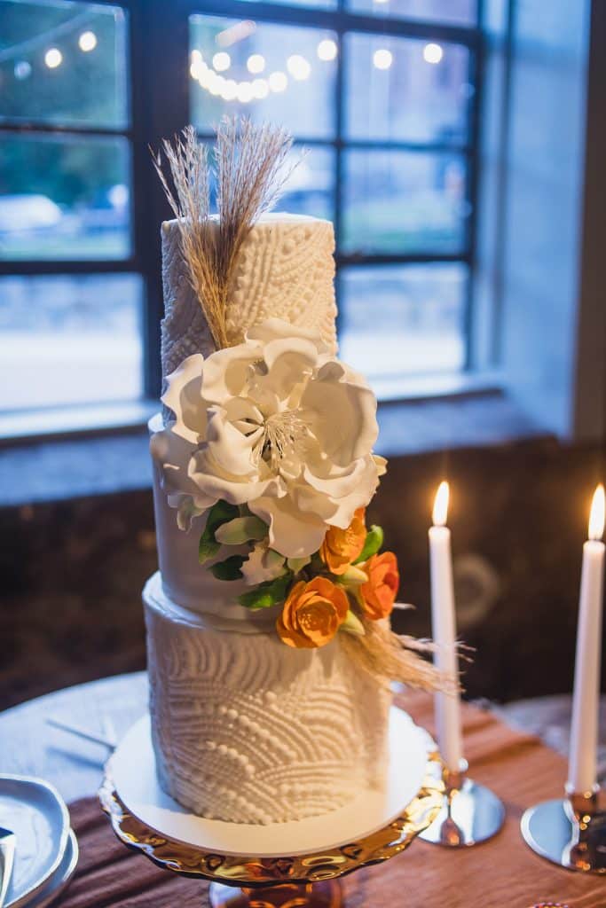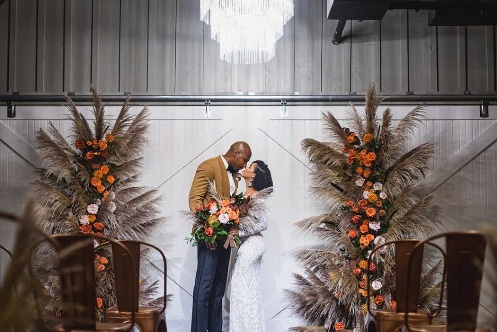 All vendors were encouraged to bring their own creative spin to the shoot. Beyonka Designs’ impressive free-standing floral designs featured stalks of pampas grass, cattails, and an array of roses. The bride’s off-shoulder dress, with geometric cutouts, and the groom’s golden tux jacket, offered a striking balance of bohemian and luxe vibes. Because many couples don’t want to limit themselves to just one look, we finished up the shoot with the bride in a one-shoulder jumpsuit and fedora with lots of boho flair.