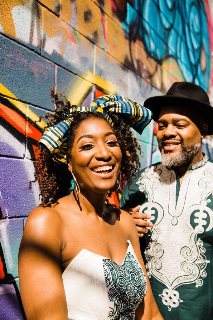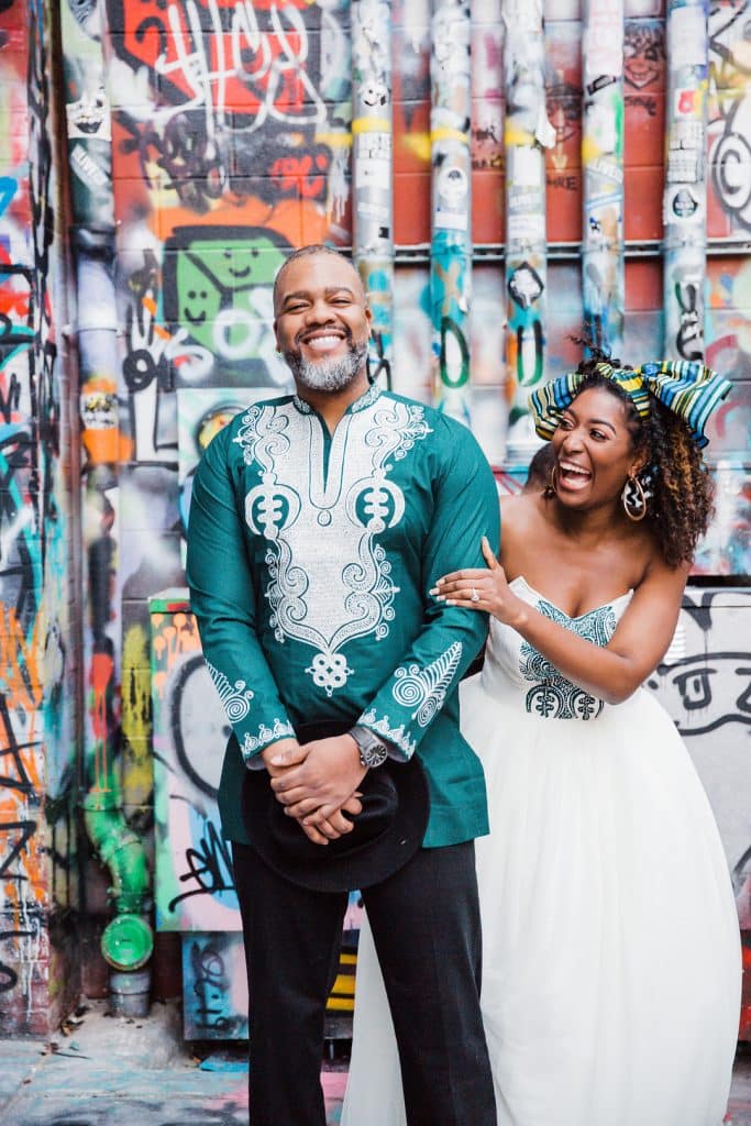 Our outfits are custom made by an African designer, TufafiNg. We wanted something to embody our culture and style. Elegant, and glam against the gritty, colorful background of graffiti alley.