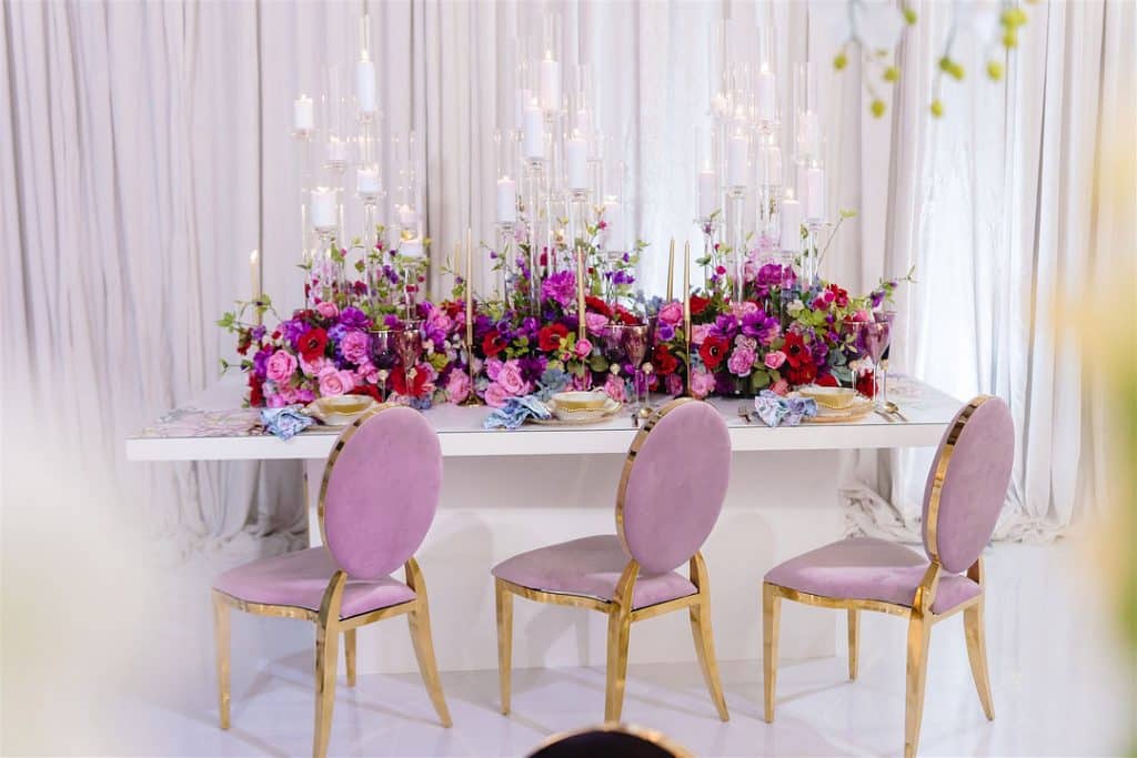 From the planner: Our styled shoot embodies a love story for a bride who is glamorous and vivacious. It’s an intricate maze representing Love’s garden, reflecting bold and vivid colors, with uplifting centerpieces firmly rooted in passion and glamour, and topped with romantic candle lights.