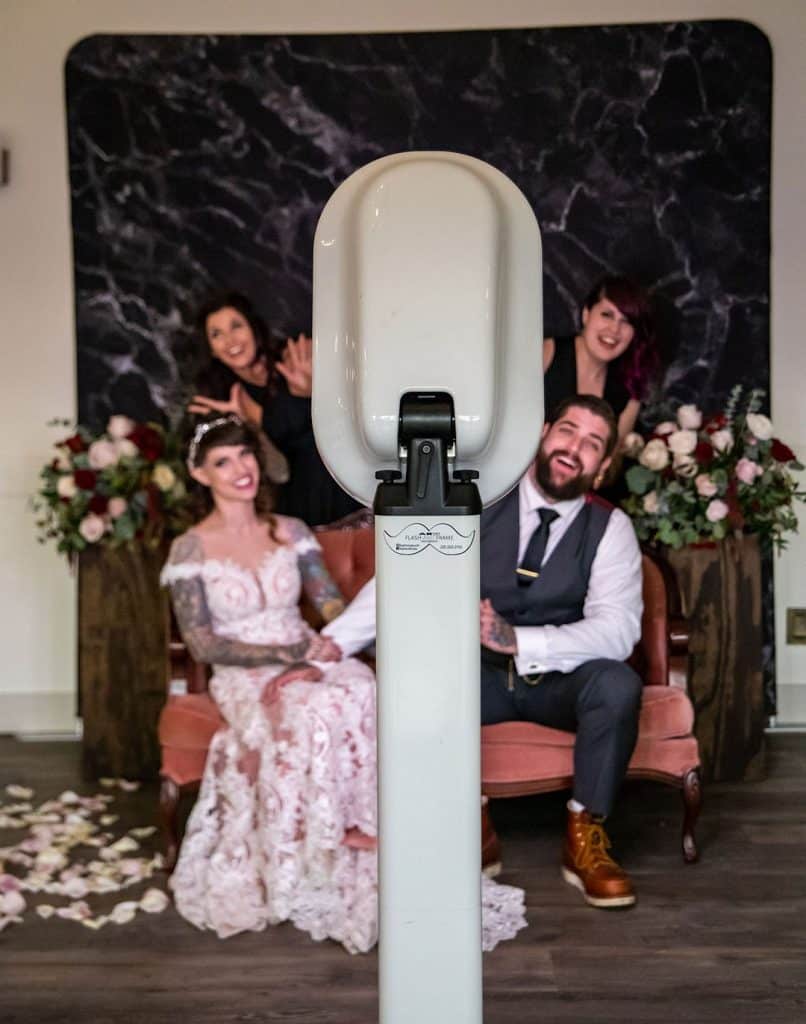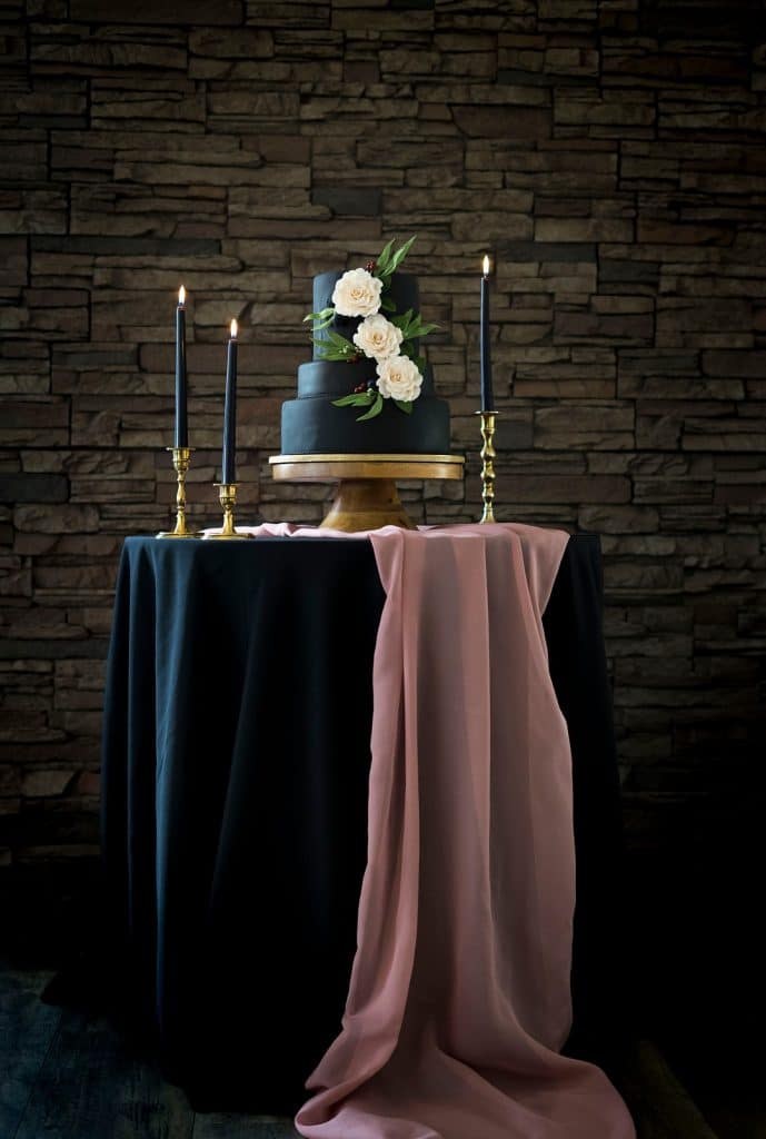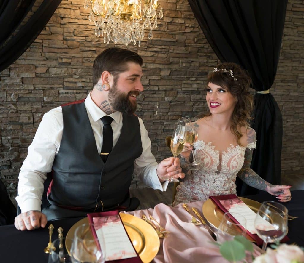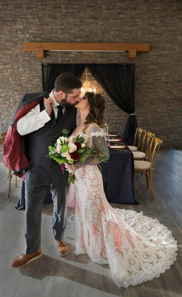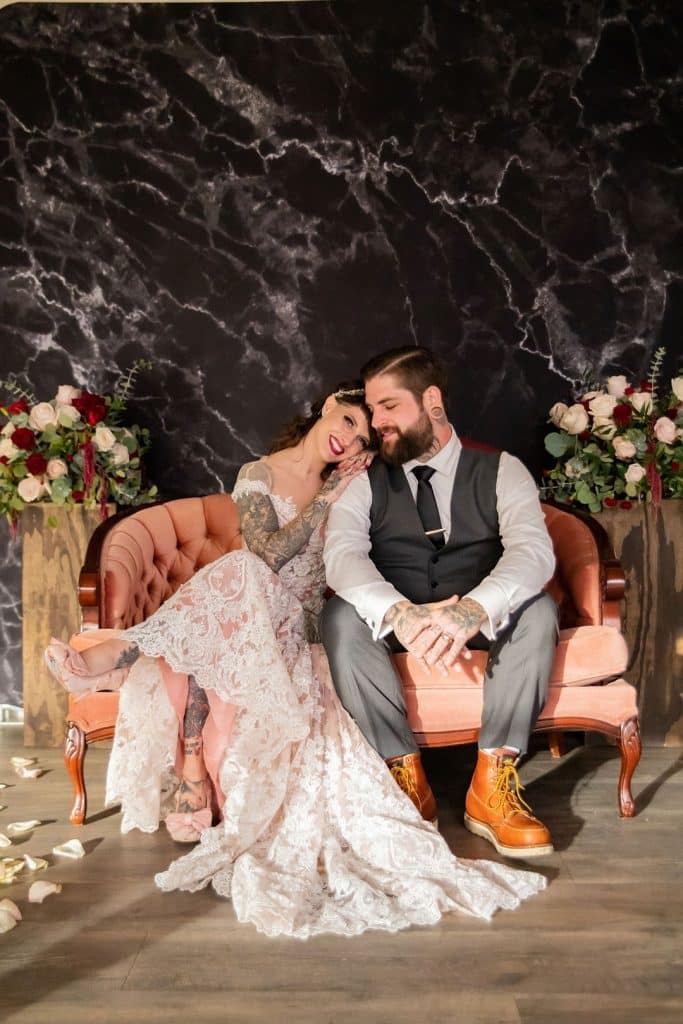 The whole idea behind this shoot was to celebrate a deep, intense love, and play off the contrast of edgy and soft – the edgy tattoos and feminine lace detailing of the dress, the black linens and soft chiffon, the stiletto nails and traditionally romantic roses and lush greenery. We adored the way that our bride’s, nearly fully tattooed body contrasts the soft, romantic lace of her blush dress, and the way the vintage loveseat with the lush floral pillars and marble backdrop gave a hint of a boudoir feel.