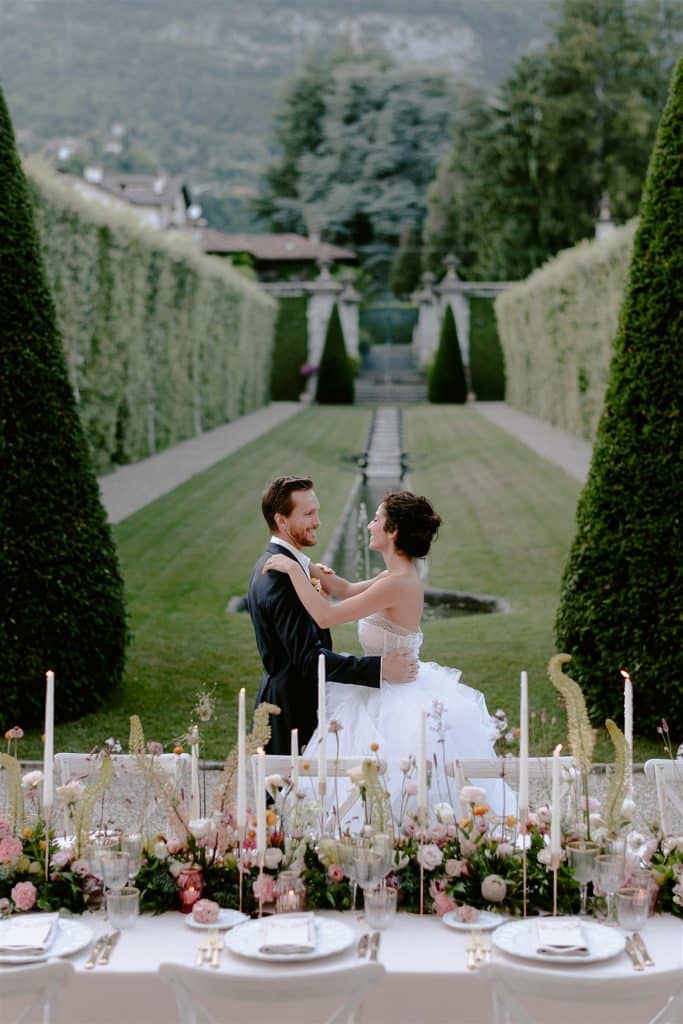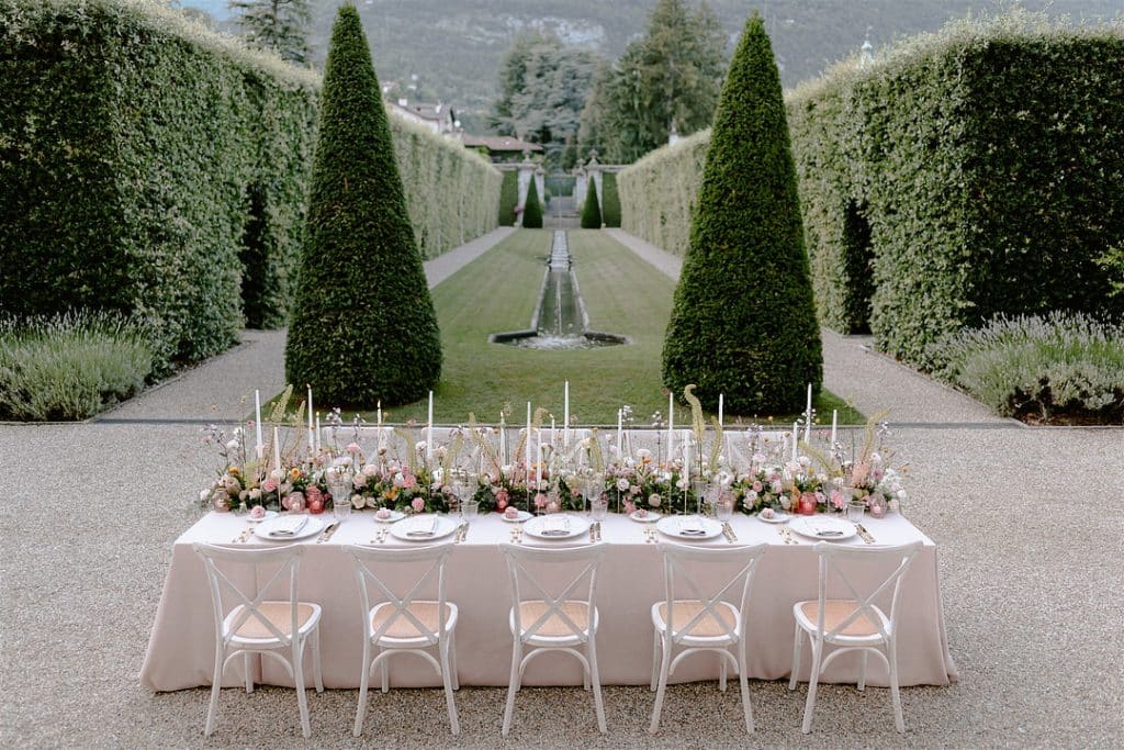 A historical palazzo, a young couple, and an enchanting lake; all these features inspired us to create a dreamy and romantic styled shoot with a magical garden vibe. The mood was ethereal, timeless, and fairy-tale inspired with soft and fair colors for the decorations in white, blush, and pink. The bride’s dress totally matched the theme, with its soft and light shape, and was perfectly framed by the garden of the Villa. A swing full of flowers, an original and elegant cake, and a romantic escape on a motorboat on the waters of Lake Como made this shooting even more magical and enchanting!
