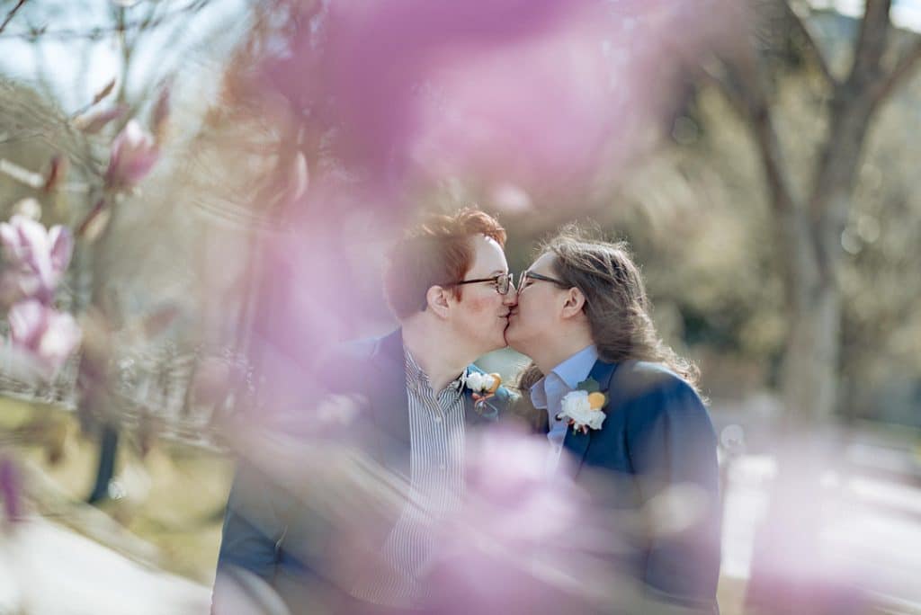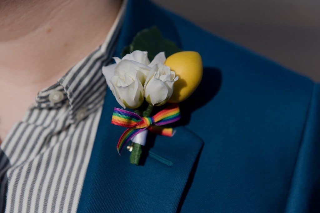We looked at museums we liked for a location, but finally decided to get married on the steps of the Library of Congress. With our love of books and the picturesque surroundings, it made the most sense for us. We put miniature lemons and roses with rainbow ribbons in our boutonnières and pins for our small entourage of guests, donned our blue and turquoise suits, and carried our rainbow flag with us. We wanted to not spare an expense here and had our suits made special for us by the Tailory. They specialize in queer fashion and suits. We chose special details for them, like my leafy plant suit lining and 3.14.2020 embroidered inside of the jackets. My partner’s suit was a navy blue with lavender lining details (their favorite colors) and mine a darker turquoise with the leafy lining details.