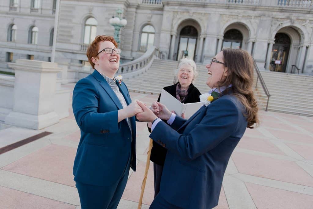Our ceremony was brief, but we wanted to share that moment with all of our friends across the world or who couldn’t be there. We had a Live Stream running of our ceremony, when a loud siren began blaring all around us. An emergency PSA sounded in the middle of our vows and we paused, laughed, and waited. The whole thing felt very dystopian and significant, and looking at each other, hands joined, it was perfect. Afterwards, we took photos around the emptied city, waving our rainbow flag between us in front of the Capitol.