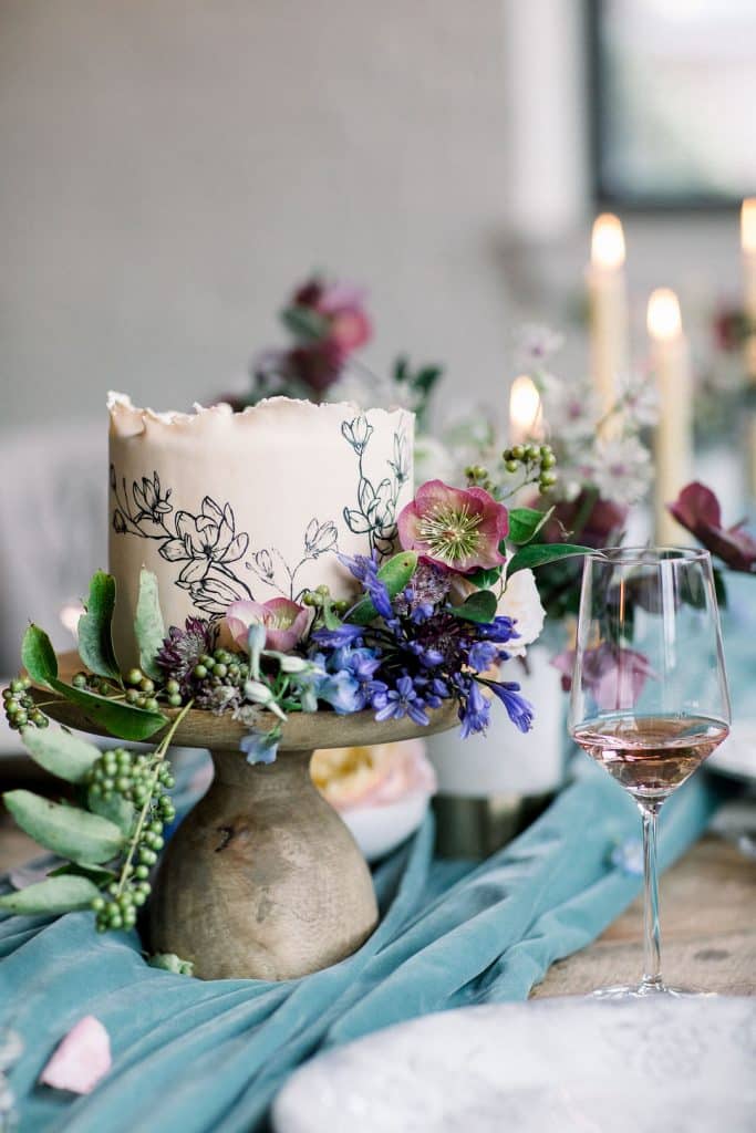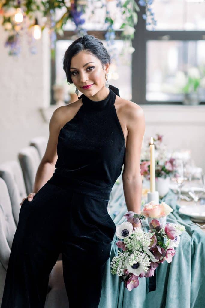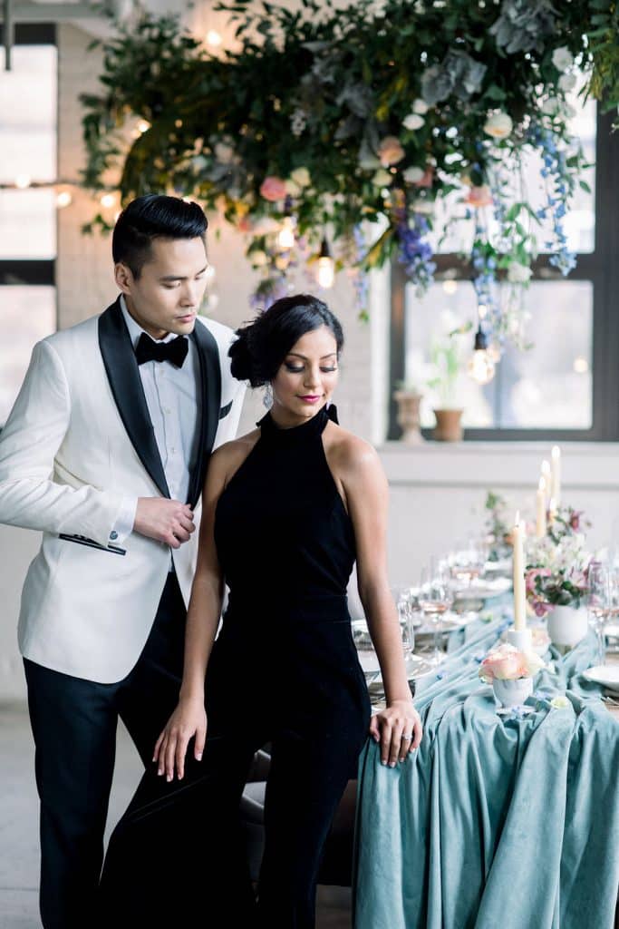 This collection of colors, textures, and florals creates the dream fusion of a modern, yet vintage wedding. There is something so pleasing about the bold punch of this color palette – the dramatic black details created a clean and contemporary look. The florals make sure that this dramatic aesthetic doesn’t get by without a touch of romance. Even the cake and signature drinks were showered with flowers, adding total sunshine vibes to the table arrangements.