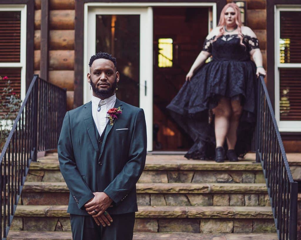 Our Halloween-inspired styled shoot took place in a beautiful, moody wooded setting, with an ambiance of dark elegance. The juxtaposition between light and dark, beauty and non-beauty, played against hints of light colors mixed with the dark tones and touches of modern accents with vintage flair. The contrasting floral arrangements featured deep traditional tones with pops of light colors, bring this dark, yet beautiful set to life.