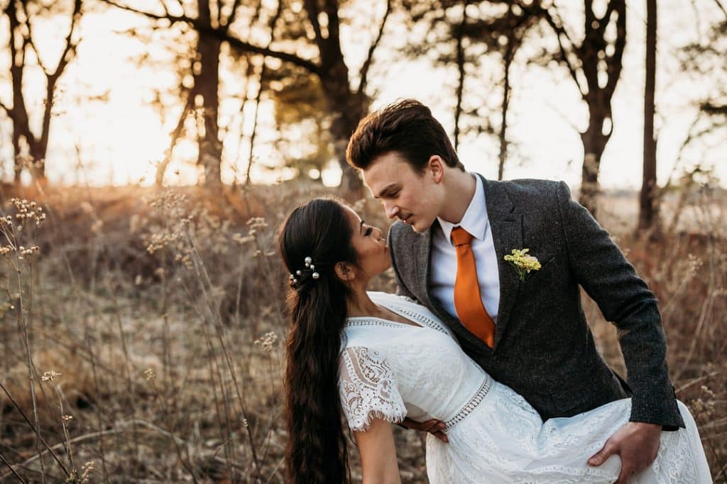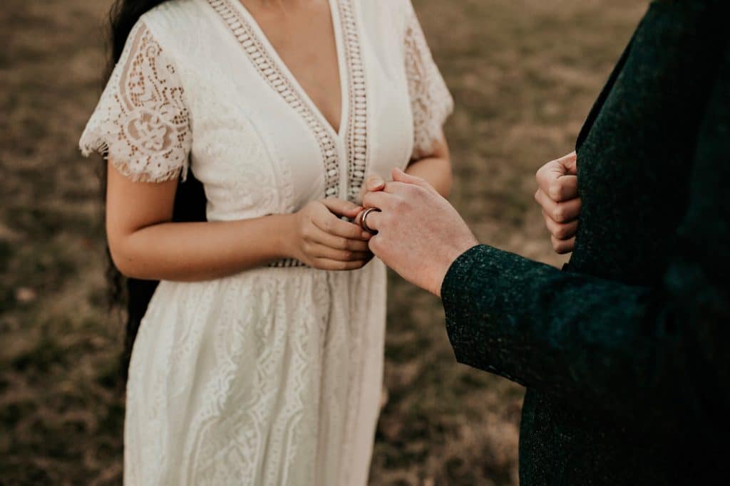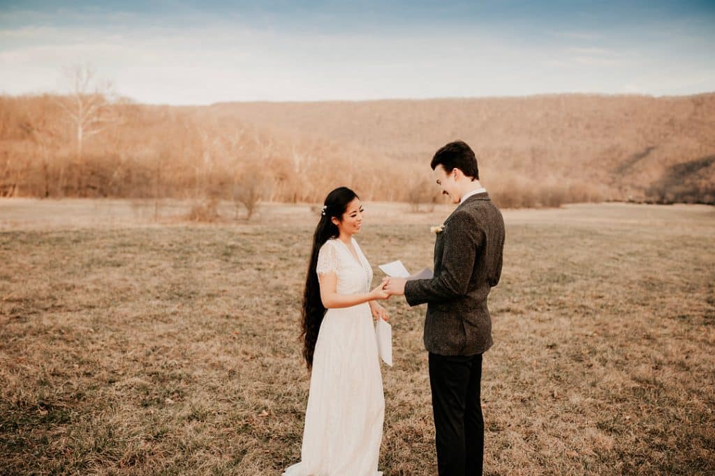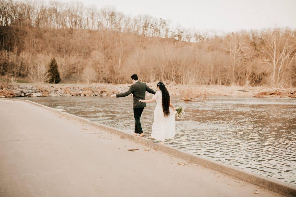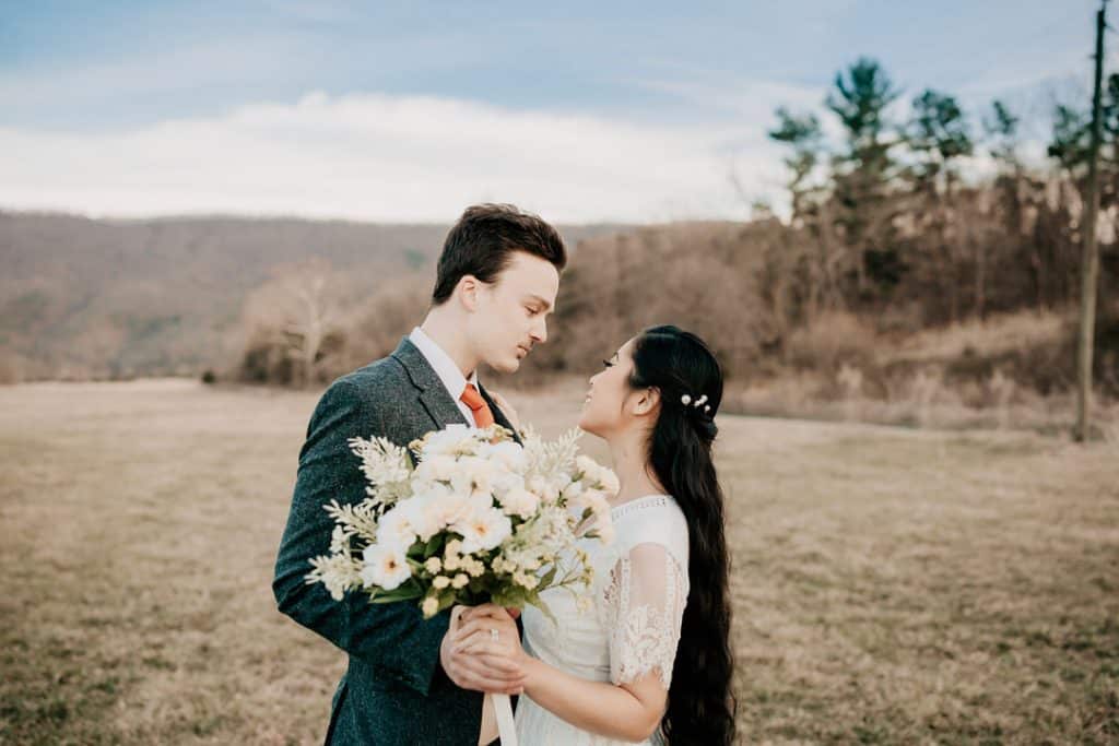 My vision for this shoot was a simple mountain elopement – something to show the couple’s intimate love for each other. I picked a location with fields, woods, mountains, and rivers, to tell a story of adventure. But when all of your vendors back out at the last minute, it’s hard not to panic. Fortunately, I had the most easy going couple to work with, who made every stressful moment worth it. I scrambled to make a bouquet (with no floral arrangement skills or experience) with fake flowers from WalMart, and purchase an elopement-styled dress and fake rings. Everything was worth it though, the moment Condrea and David stepped in front of my camera. The western jacket you see the bride wearing was actually mine. I wore it to the shoot that day. In the moment it just felt right to style it on the bride, and those turned out to be some of my favorite shots of the day.