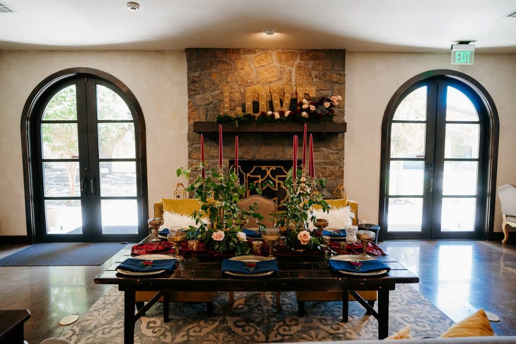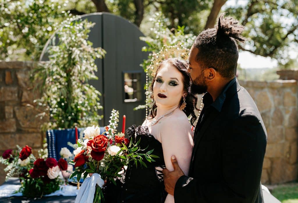 We used colors that would be bold and vibrant, and featured a biracial couple. For florals, we wanted organic shapes and lots of moss to give a sort of living, growing look to all of the designs. The colors were to be, “as red as blood and as dark as night,” as I pitched it to the venue. We used textures like velvet and fur to add to the depth of the details. I created a tea-stained look for the stationary to include wax seals and vintage accent pieces. The bride wore a gothic gold crown and a black dress to elevate the look and match her partner in his all black suit. We had such a blast designing this and hope you and your viewers love it as much as we do!