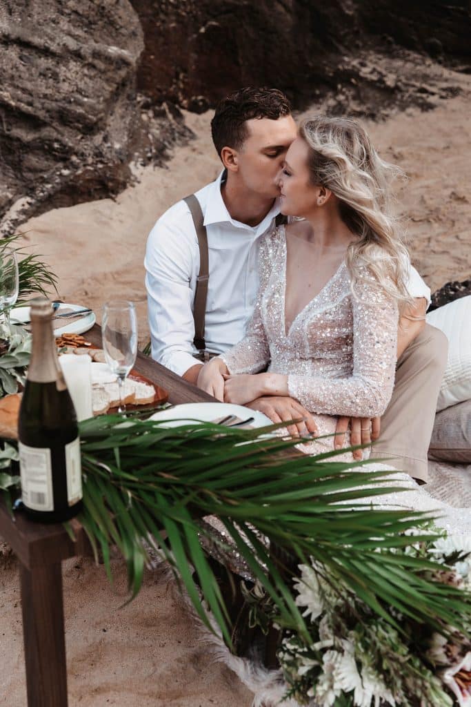 We knew we wanted to display an elopement that is fitting for the times we are in. There are brides who still want to celebrate in style during their elopement, and a luxury picnic is the perfect half-way point. The couple was able to sit and enjoy their time with the waves crashing just feet away from them. Our florist pulled together some of the most beautiful arrangements filled with greenery. The dress showed a variety of luxury, nodding to the casual nature of a beach wedding with its sheer fabric, while still upholding a fancier styling draped in sparkles.