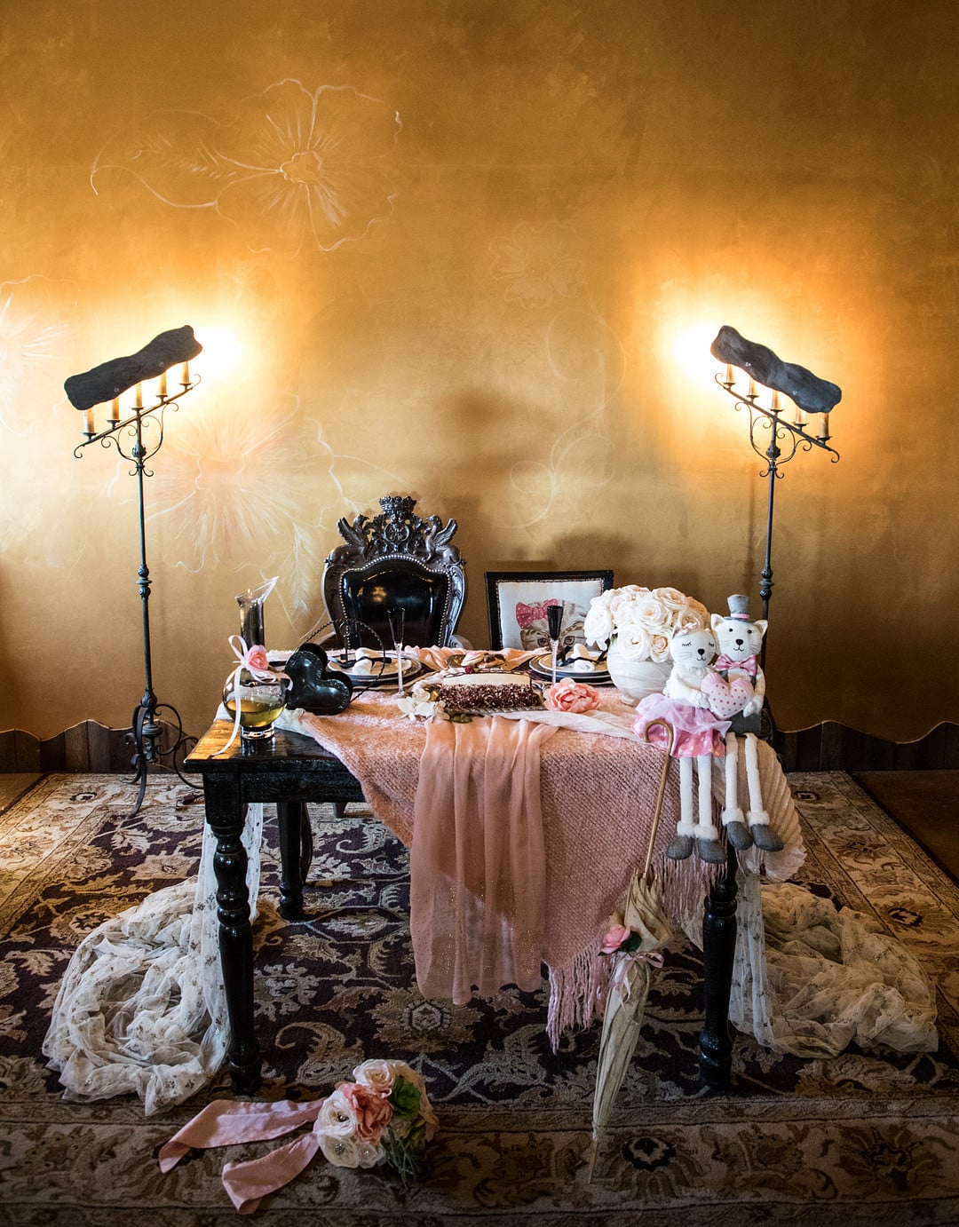As we thought about inspiration I thought about Molly Ringwald and the amazing movie styling she went through in those cheesy, yet fabulous days! The real-life couple were willing to model the shoot with us and being that Courtney had red hair, it just presented itself as a GREAT idea! I took inspiration from the character/feel of Pretty in Pink (which we remember that prom dress, oh my) and Betsy’s Wedding. Our stylist had the main idea for her to be in pants with a long wedding train. Everything else was the icing on top as we put it together!  We even had the officiant with a darker styled version of Don Johnson in Miami Vice.