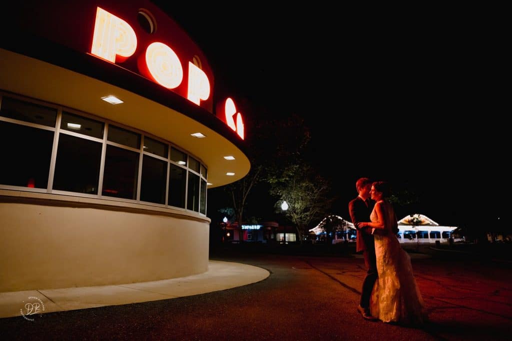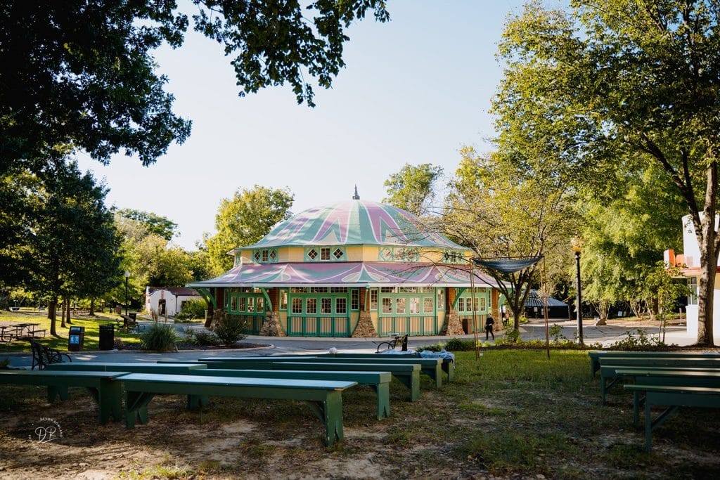 We love it when weddings take place on Glen Echo’s grassy knoll, where the 150+ year-old Carousel is the backdrop amid the amusement park facades. Benches were pulled over from the nearby Bumper Car Pavilion for casual seating for ceremony guests.