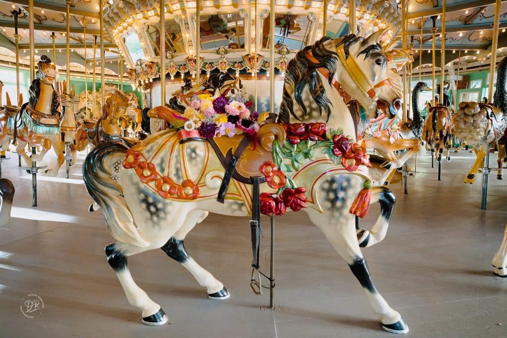 Cocktail Hour at Glen Echo comes with options, including a ride on the carousel! The bright colors of the historic surroundings were reflected in the bride’s bouquet, bursting with color, from Rockingbird Flower.