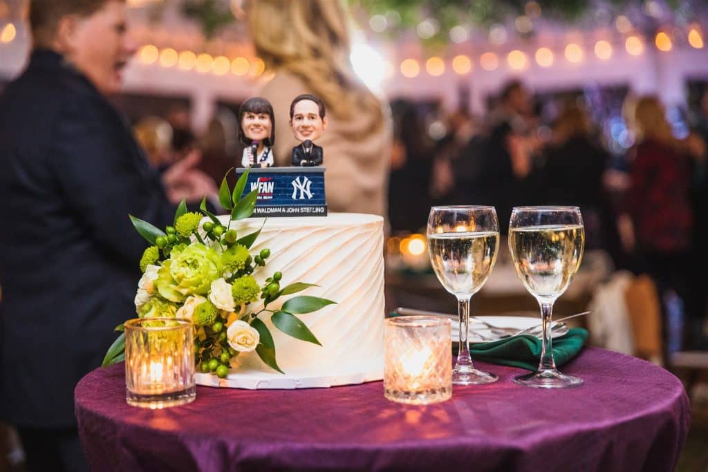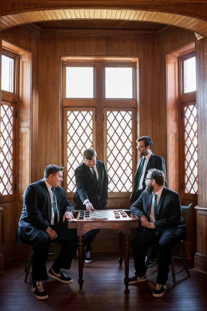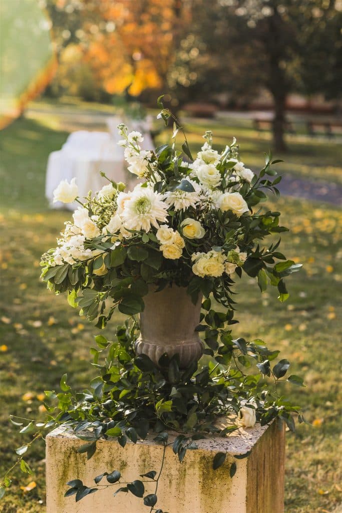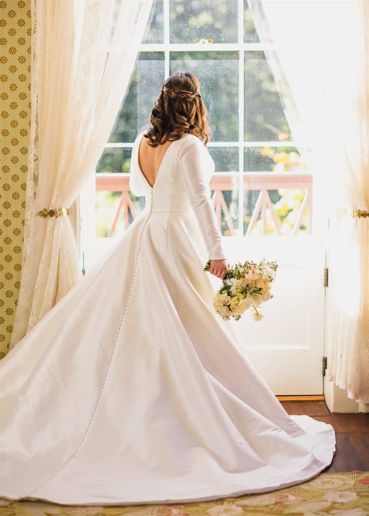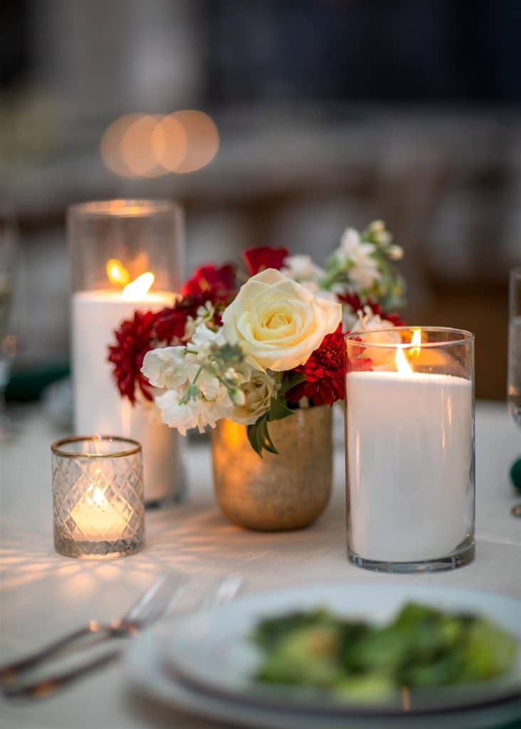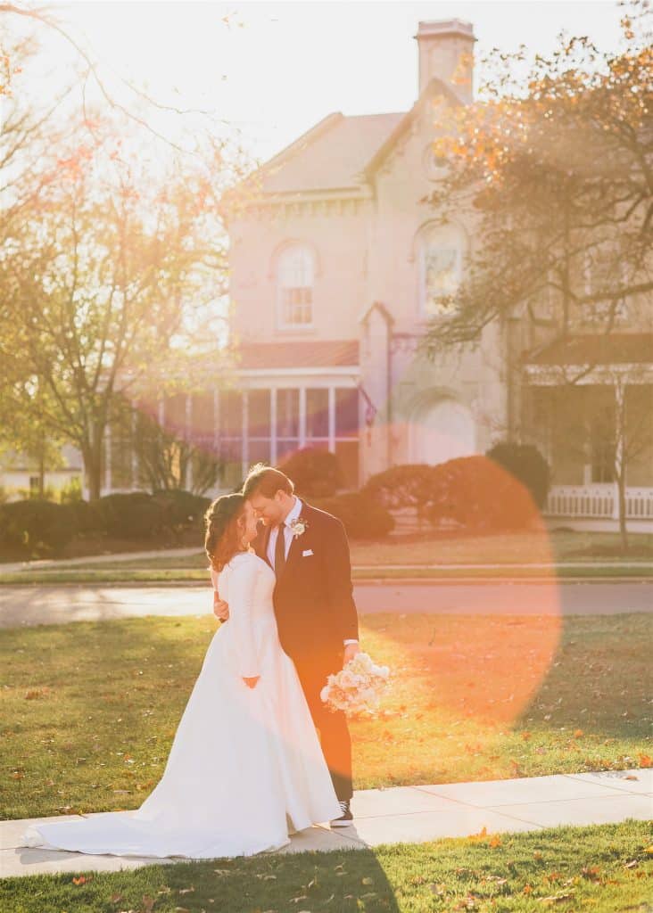 Gorgeous florals from the sustainability-minded designers at Cedar & Lime Collective provided ambience amid the lush fall foliage on the property. Neutral color choices – with a few pops of jewel tones, of course! – for both floral arrangements and decor details were in keeping with the historic venue. The golden hues of sunlight in the late fall meant that everything took on a romantic glow.