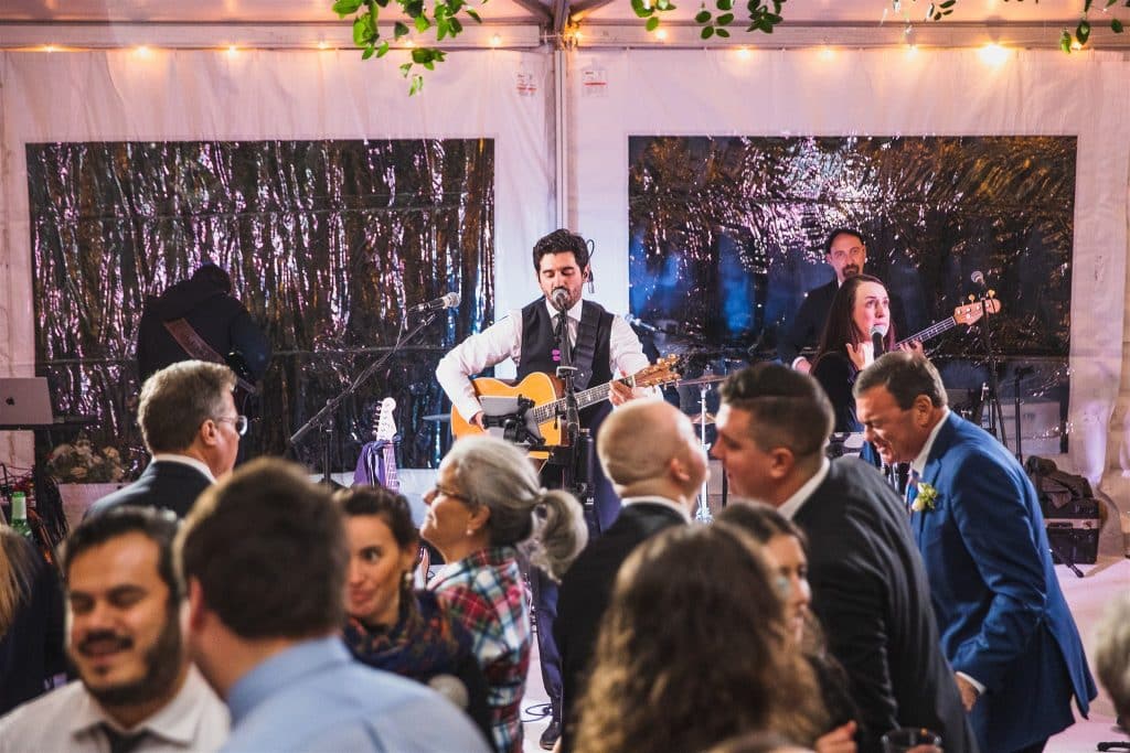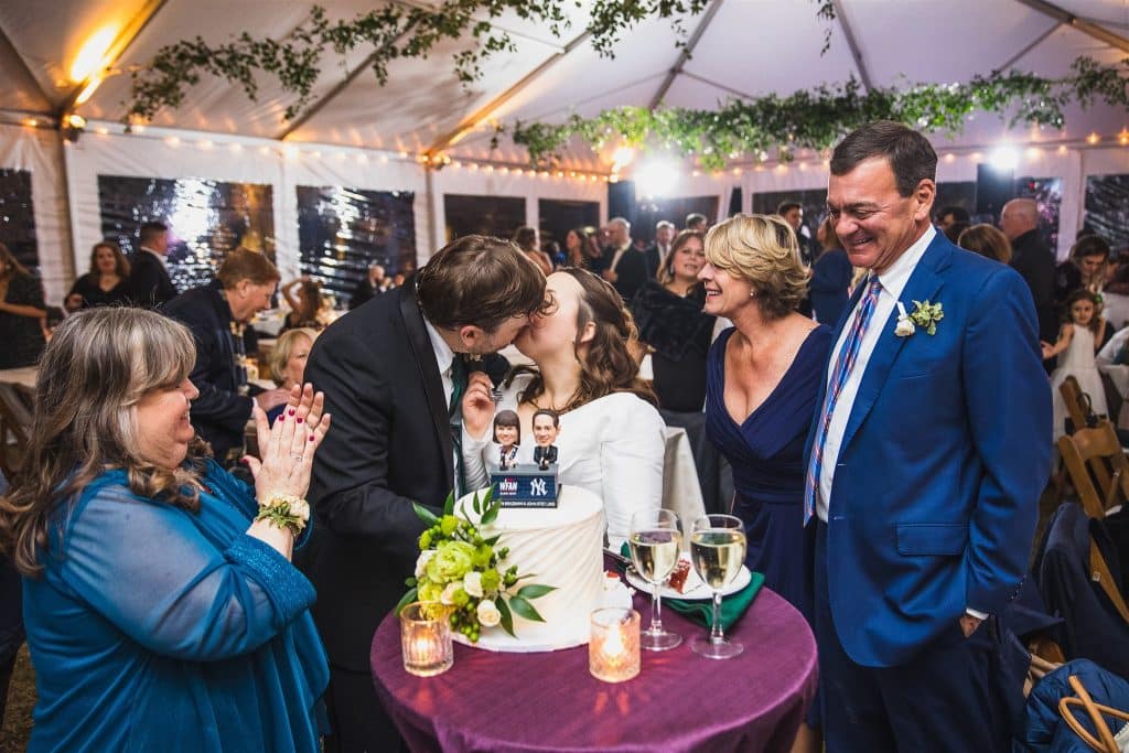 A cozy tented reception by Sugarplum Tents with live music from Sly 45 with Watershed Entertainment allowed guests to make the most of the historic grounds throughout the night. Low centerpieces on long tables lent a feeling of romance amid the glowing cafe lights. Guests were treated to Timber Pizza and local artisan gelato from Casa Rosado.