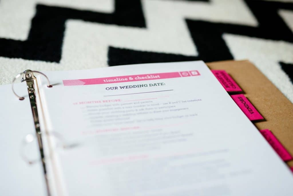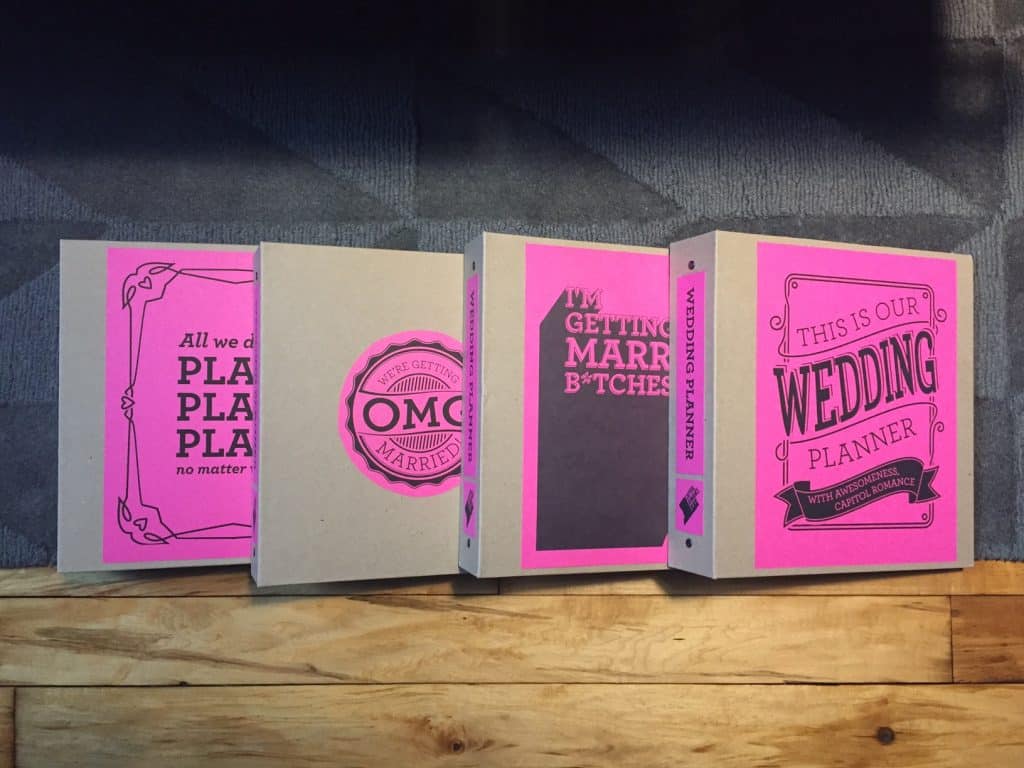 An awesome, custom 3-ring binder wedding planner to help keep you organized and get you started on your wedding planning journey. Cover available in Hot Pink, Purple & Teal.